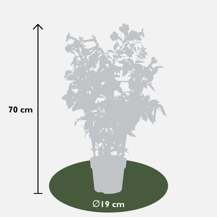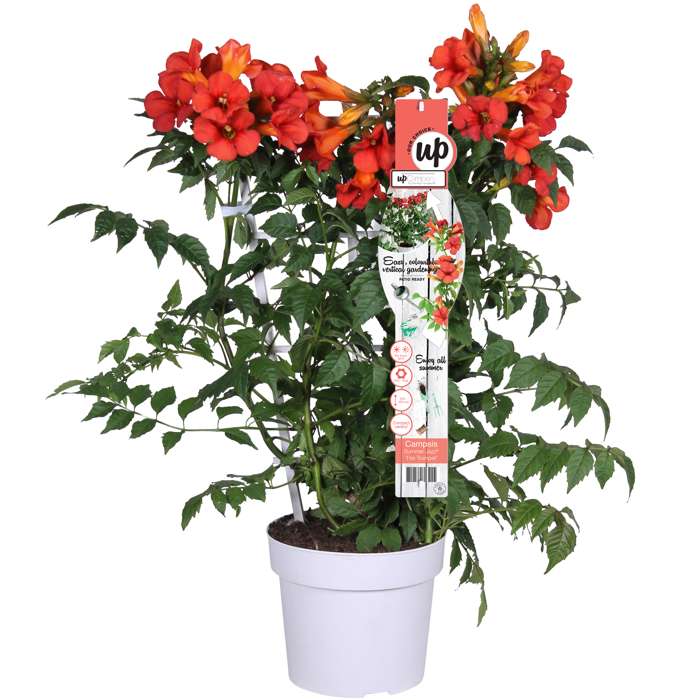 Campsis Summer Jazz Fire Trumpet‘ ist eine winterharte Kletterpflanze, die an einem sonnigen Standort reichlich und lange blüht. Die rotblühende Campsis wächst kompakter als die anderen Arten der Summer Jazz-Serie und wird bis zu 3 Meter hoch. Der Spätsommerblüher neigt dazu, einen Strauch zu bilden. Wenn Sie möchten, dass Ihre Campsis klettert, ist es sinnvoll, sie zu Beginn ihres Wachstums mit einem Klettergerüst zu unterstützen. Diese Campsis ist eine selbsthaftende Kletterpflanze, was bedeutet, dass sich an den Zweigen kleine Haftwurzeln bilden. Diese Haftwurzeln setzen sich an der Wand oder am Zaun fest. Im August und September erwarten Sie die exotischen Blüten, die Ihrem Außenbereich eine mediterrane Atmosphäre verleihen. Der trompetenförmige Blüher schätzt einen geschützten Standort und einen Rückschnitt im Frühjahr.