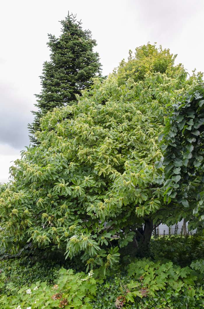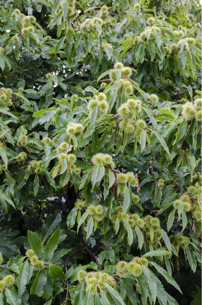 Castanea Sativa‘ ist ein großer Edelkastanienbaum mit einer breiten Krone. Der Baum kann ein Alter von 400 Jahren erreichen. Die Höhe des Baumstamms beträgt etwa 200 cm, darüber beginnen die Äste. Der Stamm ist verdreht und hat eine Rinde voller Rillen und Spalten. Junge Zweige sind olivgrün, färben sich aber später rötlich-braun. Die länglichen Blätter sind dunkelgrün, glänzend und haben einen gezackten Rand. Die jungen Blätter sind auf der Unterseite behaart. Die Früchte sind glänzende braune Nüsse. Es gibt zwei bis vier von ihnen zusammen in harten, gelb-braunen, stacheligen Schalen. Die Esskastanien, die im Herbst von den Kastanienbäumen fallen, sind essbar. Nachdem man die Kastanie von ihrer braunen Haut befreit hat, kann man sie roh essen, braten oder kochen. Esskastanien enthalten viel weniger Fett als andere Nüsse. Sie enthalten jedoch die notwendigen Kohlenhydrate, Ballaststoffe und Proteine.