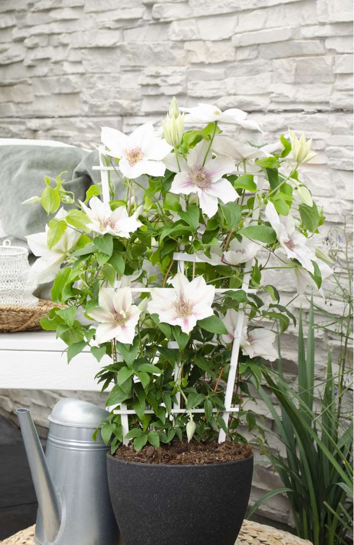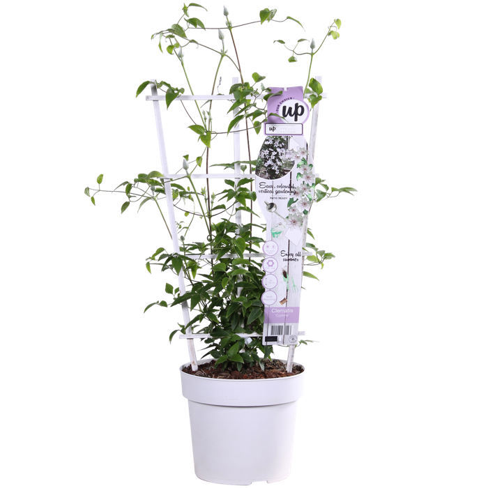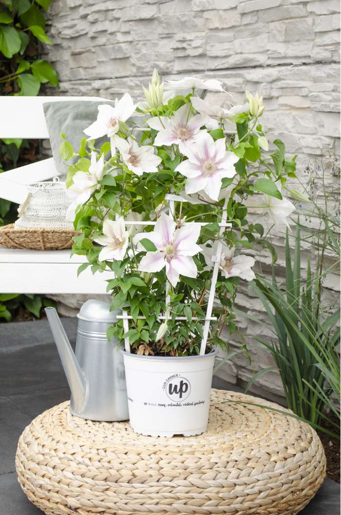 Eine ganz besondere Clematis, die den ganzen Sommer über blüht. Von Mai bis September kann man sich an ihren großen weiß-rosa gestreiften Dolden erfreuen. Die Clematis bildet im ersten Jahr eine Blütenoase. Im Gegensatz zu den meisten Clematis-Arten, die nur ein bis zwei Monate blühen, kann man sich an ‚Corinne‘ bis zu fünf Monate lang erfreuen. Auf einer Pergola oder einem Klettergerüst wird ‚Corinne‘ maximal 180 cm hoch. Diese Clematis bevorzugt einen Platz in der (halb)vollen Sonne. Ein Platz in der Morgen- und/oder Abendsonne ist am besten geeignet. Da ‚Corinne‘ eine kompakte Sorte ist, kann sie auch in einem Topf auf dem Balkon, der Terrasse oder sogar in einer Blütenampel stehen. Damit die Clematis besser klettern kann, braucht sie ein wenig Hilfe. Am besten ist es, die Pflanze an einem Gestell, Draht oder Stock entlang zu führen. Ein Rückschnitt ist nicht erforderlich. Entfernen Sie jedoch Anfang März abgestorbene und beschädigte Zweige. Sie können diese Clematis im Frühjahr auf eine Höhe von maximal 20 Zentimetern über dem Boden zurückschneiden.