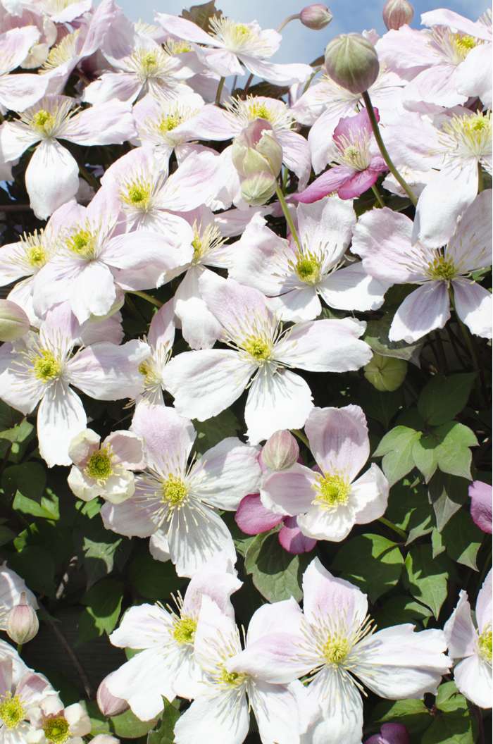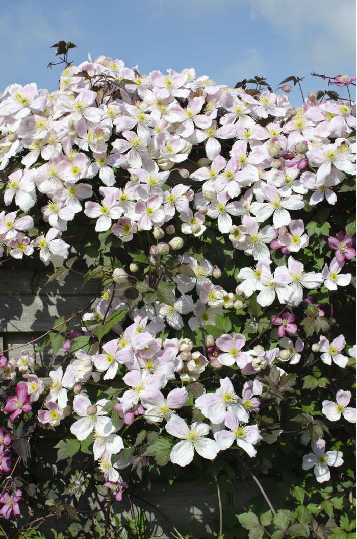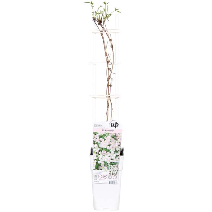 Die Clematis ‚Montana‘ ist eine unserer Lieblingssorten. Sie ist eine kräftige Kletterpflanze, die schnell wächst und sehr üppig mit zahlreichen fröhlichen Blüten blüht. Die ‚Montana‘-Sorten wachsen schneller als die großblumigen Clematis-Sorten. Die Clematis ‚Montana‘ aus der Serie ‚Our Choice‘ zeichnet sich durch eine längere und reichere Blüte aus und ist widerstandsfähiger gegen Krankheiten als die normalen ‚Montana‘-Sorten. Sie bleiben viel kompakter und werden 2 bis 3 Meter hoch. Diese Waldrebe kann in einen großen Topf oder Pflanzkasten gesetzt werden, sie kann aber auch an einem Klettergerüst wachsen. Sie blühen im Mai/Juli mit intensiv gefärbten kleinen Blüten, die sich mit zunehmendem Alter verfärben. Stellen Sie diese Clematis in die volle Sonne oder in den Halbschatten. Wenn die Clematis in der prallen Sonne steht, ist es wichtig, dass die Wurzeln nicht in die Sonne gestellt werden. Bedecken Sie den Wurzelballen gut und pflanzen Sie ihn 10 bis 15 cm tief ein. Nach der Blütezeit kann die Pflanze auf 50 cm zurückgeschnitten werden. Das Beschneiden hält die Pflanze jung und in Form, aber es ist nicht notwendig, sie zu beschneiden.