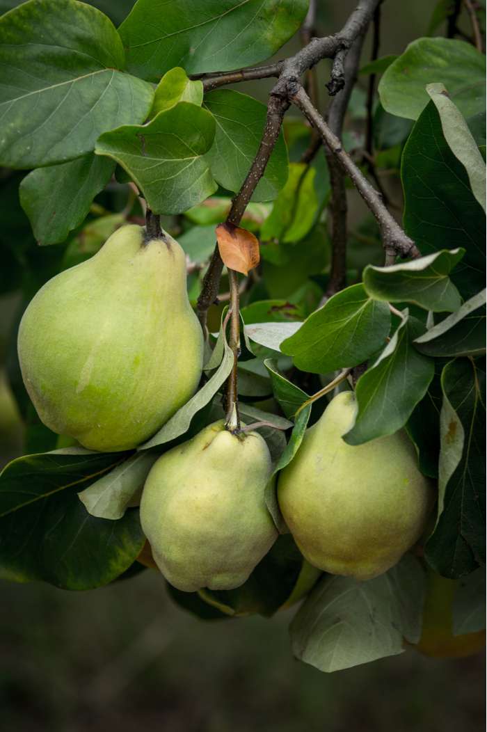 Die Quitte ist ein langsam wachsender Baum, der mit einer Höhe von 3-5 m auch für kleinere Gärten geeignet ist. Die dichte Krone ist breit und rund. Die großen, eiförmigen, olivgrünen Blätter sind auf der Unterseite leicht behaart und haben einen herzförmigen Blattgrund. Die Blätter färben sich im Herbst auffällig gelb. Cydonia blüht im Mai mit 4-5 cm großen, einfachen Blüten, die weiß bis weißlich-rosa gefärbt sind. Nach der Blüte folgen gelbe, birnenförmige, duftende Früchte. Vranja‘ hat größere Früchte als die Art. Sie reifen nur, wenn die Pflanze an einem geschützten, warmen Ort steht. Gekocht können sie in verschiedenen Gerichten verwendet werden.