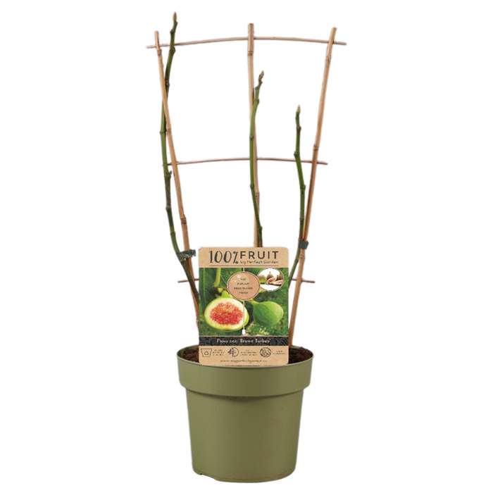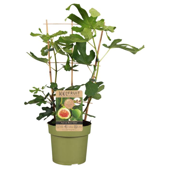 Ficus Carica Brown Turkey‘ ist als die beliebteste Feigensorte bekannt, da sie regelmäßig große Mengen an mittelgroßen Früchten mit dunkelrotem Fruchtfleisch hervorbringt. In Ausnahmejahren kann sie drei Ernten pro Jahr bringen. Die Blätter des Feigenbaums sind handförmig und am besten aus der Darstellung von Adam und Eva in der klassischen Malerei bekannt, wo das Feigenblatt zur Bedeckung des nackten Körpers verwendet wurde. Die Früchte reifen besser, wenn Sie den Baum während des Winters schützen. Der Feigenbaum braucht einen geschützten, aber sonnigen Standort, der möglichst warm sein sollte. Ein nach Süden ausgerichteter, windgeschützter Garten ist also optimal. Sie können den Feigenbaum in den Garten, auf den Balkon oder die Terrasse pflanzen. Wenn die Pflanze in einen Topf gepflanzt wird, ist es am besten, sie im Winter ins Haus zu holen. Sie wächst schnell, und wenn man sie nicht beschneidet, wird sie einige Meter hoch. Wenn Sie meinen, dass die Zweige zu lang werden, können Sie die Feige beschneiden.