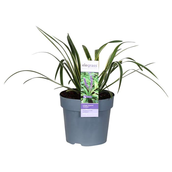 Liriope muscari Variegata‘ ist eine immergrüne Pflanze mit schmalen, grün-weiß gestreiften, grasartigen Blättern. Die Blütezeit von ‚Liriope muscari Variegata‘ ist von August bis Oktober. In dieser Zeit bildet die Pflanze wunderschöne blau-violette Blütenbüschel. Liriope Muscari‘ wird 25 bis 30 cm hoch und ist damit ein perfekter, niedrig wachsender Bodendecker unter Büschen und kleinen Bäumen. Das Liliengras steht gerne im Schatten und braucht keinen Rückschnitt.