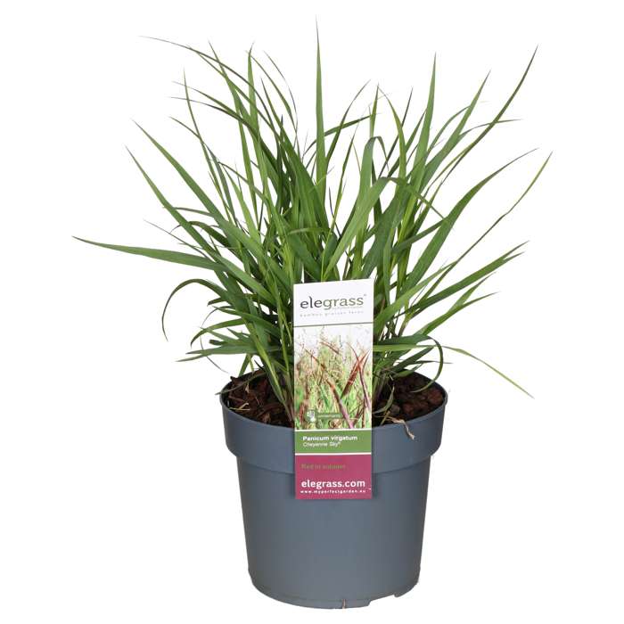 Panicum Virgatum Cheyenne Sky‘ ist ein kompaktes Gras mit auffälligen, schmalen und bogenförmigen Blättern. Blaugrüne Blätter erscheinen im späten Frühjahr. Gegen Ende des Sommers färben sich die Blattspitzen von graugrün zu tiefrot. Die Blütezeit ist im Spätsommer mit duftenden graubraunen Rispen mit rosa Farbton. Panicum virgatum‘ bleibt bis tief in den Winter hinein attraktiv, wenn es seine Blätter verliert. Das Ziergras wird maximal 100 cm hoch und ist daher auch für kleinere Gärten geeignet. Sie sieht allein in einem dekorativen Topf oder in kleinen Gruppen gut aus, so dass sie ein wenig mehr auffällt. Panicum Virgatum‘ bringt immer Farbe in Ihren Garten!