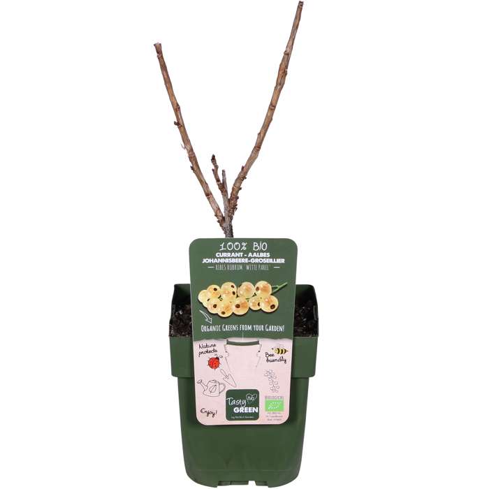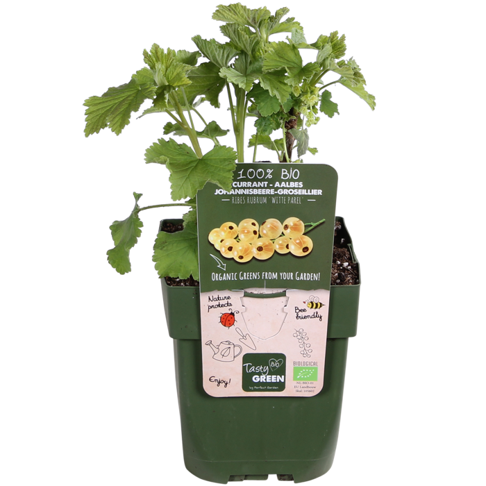 Leckeres grünes Obst aus 100% biologischem Anbau. Das bedeutet, dass beim Anbau nur pflanzliche und tierische Materialien verwendet wurden. Der Topf und das Etikett bestehen aus recyceltem Kunststoff und sind somit eine saubere Lösung für die Umwelt. Die Weiße Johannisbeere (Ribes rubrum ‚White Pearl‘) ist ein bekannter Beerenstrauch. Die Beeren können ab Juni/Juli geerntet werden. Die Weiße Johannisbeere (Ribes rubrum ‚White Pearl‘) verliert im Winter ihre Blätter, ist sehr winterhart und verträgt problemlos Temperaturen bis zu -34 Grad Celsius. Wenn Sie die Weiße Johannisbeere an einen sonnigen Platz pflanzen, können Sie sich über eine gute Ernte gesunder weißer Beeren freuen. Ribes rubrum ‚White Pearl‘ bildet große, weiße Beeren. Ribes rubrum ‚White Pearl‘ bildet im Sommer lange Trauben mit sehr wohlschmeckenden weißen Beeren. Reichhaltig bestückt. Schneiden Sie im Winter schwere (Seiten-)Äste zurück.