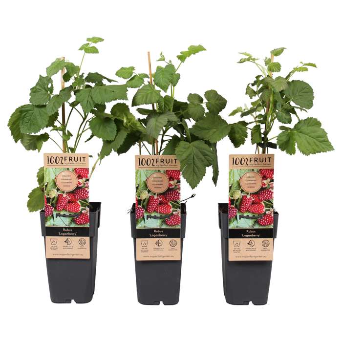 Rubus Thornless Loganberry‘ ist eine Loganbeere, die eine Kreuzung zwischen Brombeere und Himbeere ist. Dies ist eine dornenlose Variante der Loganbeere. Sie hat längliche, schwarz-rote Früchte, die größer als Himbeeren sind. Der Geschmack liegt zwischen dem von Himbeeren und Brombeeren, sehr aromatisch und ein wenig sauer. Die Früchte sind zwischen Ende Juli und September reif. Köstlich zum Verzehr direkt von der Pflanze, aber auch für Marmelade, Wein oder Desserts. Wie bei der Himbeere und der Brombeere stirbt auch bei der Loganbeere der Zweig ab, der die Früchte getragen hat. Diese kann im Winter abgeschnitten werden. Die verbleibenden jungen Zweige werden im nächsten Jahr Früchte tragen. Die Pflanze bevorzugt einen Platz an der Sonne. Je mehr Sonne sie bekommt, desto besser reifen die Früchte. Die Pflanze muss gestützt werden, da die Zweige zu schwach sind, um aufrecht zu stehen. Binden Sie sie deshalb an ein Klettergerüst, eine Wand oder einen Zaun.