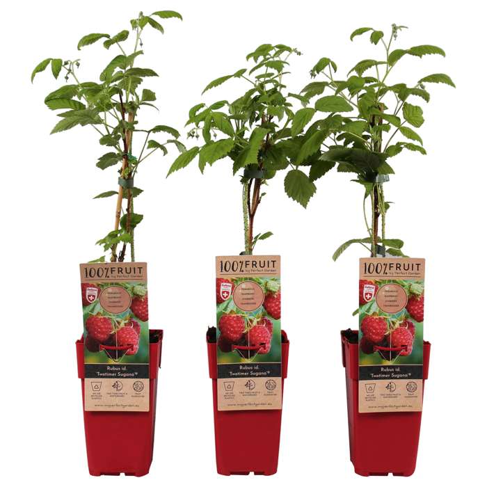 Rubus Idaeus Twotimer Sugana Red‘ ist die einzige Himbeere, die zweimal im Jahr Früchte trägt. Eine echte Bereicherung für Ihren Garten! Die Himbeeren sind köstlich süß und leuchtend rot. Sie sind sehr gesund und enthalten viele Antioxidantien, Mineralien und Vitamine. Der Strauch wächst aufrecht und kann eine Höhe von etwa 180 cm erreichen. Diese Sorte eignet sich für kleinere Gärten, sogar für den Balkon. Im Juni erfolgt die erste Ernte an den alten Zweigen des Strauches, im Herbst die zweite Ernte an den neuen Zweigen. Die Himbeere ist leicht zu pflegen und kann in allen Klimazonen überleben. Im ersten Jahr brauchen Sie den Strauch nicht zu beschneiden. Danach können Sie die Zweige im zeitigen Frühjahr zurückschneiden. Die Pflanze hat ein stabiles Wachstum und eine gute Resistenz gegen Krankheiten. Auch Vögel lieben Himbeeren, also schützen Sie den Strauch z. B. mit einem Netz.