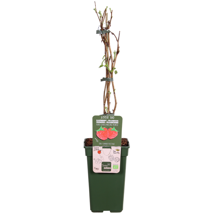 Rubus Idaeus Malling Promise‘ ist eine der bekanntesten Himbeersorten. Diese Himbeere ist selbstbestäubend und blüht im späten Frühjahr mit unscheinbaren, kleinen weiß-rosa Blüten, die Bienen und Hummeln anziehen. Nach der Blüte entwickeln sich die Himbeeren. Die Früchte sind ziemlich weich, leuchtend rot und haben einen milden Geschmack. Rubus idaeus Malling Promise‘ ist eine Sommerhimbeere, deren Früchte ab Juli geerntet werden können. Himbeeren eignen sich hervorragend zur Herstellung von Marmelade und Saft, schmecken aber auch frisch vom Strauch und in Desserts oder Kuchen. Rubus idaeus Malling Promise‘ ist ein kräftiges Gewächs und muss wie jede Himbeere gut erzogen und beschnitten werden, um den besten Ertrag und Geschmack der Früchte zu erzielen. Es handelt sich um eine klassische, ertragreiche Sommerhimbeere, die ziemlich große Früchte von gutem Geschmack hervorbringt.