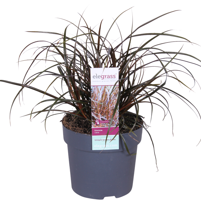 Uncinia rubra‘, auch Rotsegge genannt, ist ein auffälliges Gras mit zierlichen roten, dünnen Blättern. In den Sommermonaten blüht die Pflanze mit rotbraunen Rispen und wird bis zu 40 cm hoch. Diese rote ‚Uncinia‘ ist eine prächtige Pflanze, die sich gut in einem Topf auf dem Balkon oder der Terrasse macht. Sie ist eine kräftige Pflanze, die Sonne verträgt, aber Vorsicht vor strengem Nachtfrost. Die ‚Unicina‘ stammt aus Neuseeland und muss daher im Winter abgedeckt werden, um zu überleben.