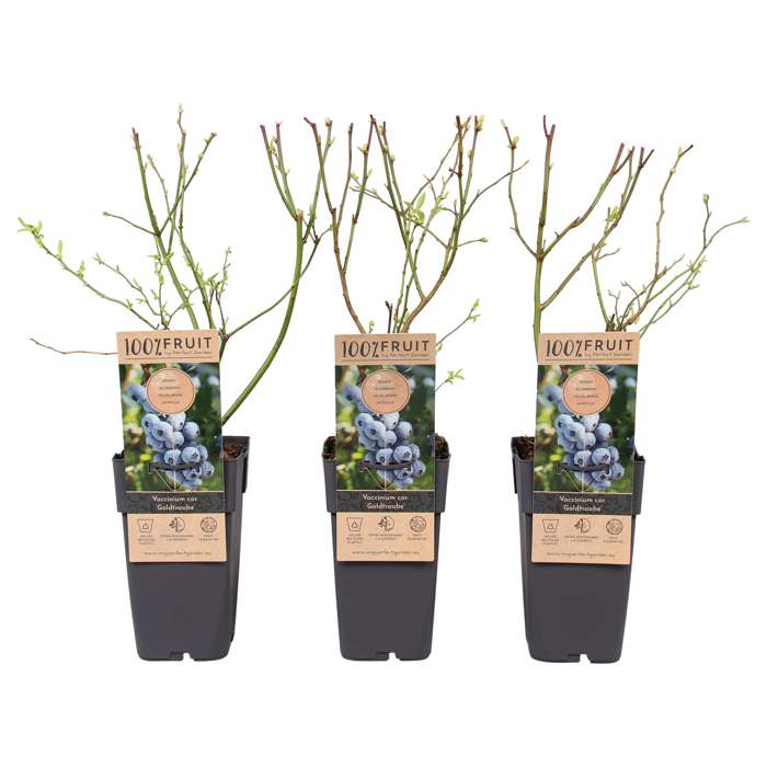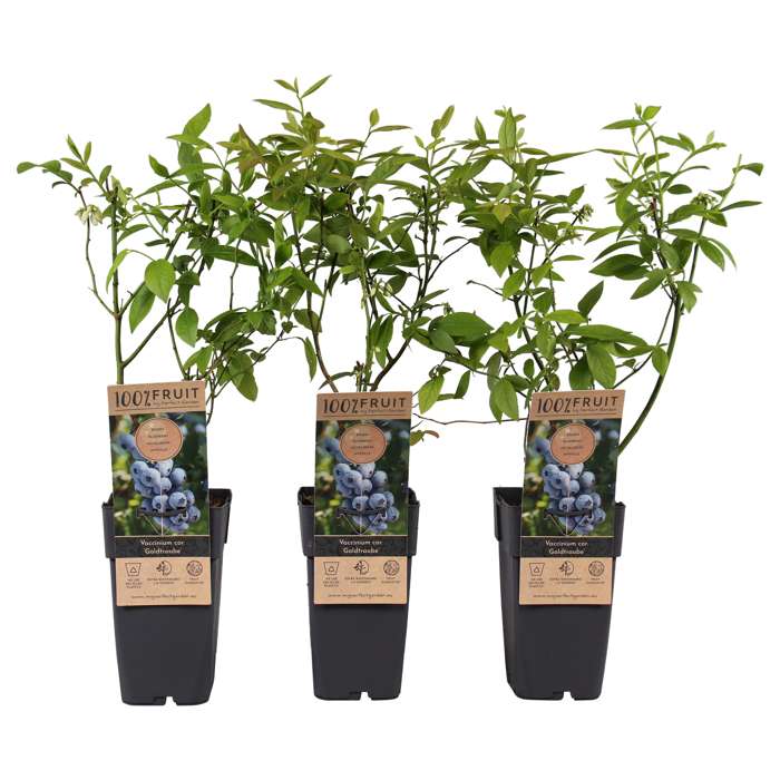 Vaccinium Corymbosum Goldtraube 71′ ist eine Heidelbeere, auch Amerikanische Heidelbeere genannt. Der Strauch wird etwa 1,5 bis 2 Meter hoch und 150 cm breit und wächst nur auf sauren Böden. Sandige und torfhaltige Böden sind sauer und daher für diese Pflanze geeignet. Wenn Sie die Pflanze in Lehmboden setzen wollen, müssen Sie saure Erde hinzufügen, damit die Pflanze überleben kann. Sie hat dünne Zweige und kleine, frischgrüne Blätter. Die Blaubeere blüht in Büscheln und die Blüte ist cremeweiß bis rosa gefärbt. Die Blüte erfolgt in der ersten Maihälfte. Sie ist eine kräftige Pflanze, die sehr viele Früchte trägt. Die Beeren sind mittelgroß, hellblau, fest und haben einen köstlichen Geschmack. Sie enthalten viele Antioxidantien, also super gesund! Sie können von Mitte Juli bis Mitte August gepflückt werden. Frische Heidelbeeren sind eine Woche lang haltbar, können aber auch eingefroren werden. Diese Pflanze ist selbstbestäubend und benötigt fast keine Pflege. Schützen Sie die Beeren mit einem Netz vor Vögeln. Die Pflanze ist widerstandsfähig und resistent gegen Krankheiten.