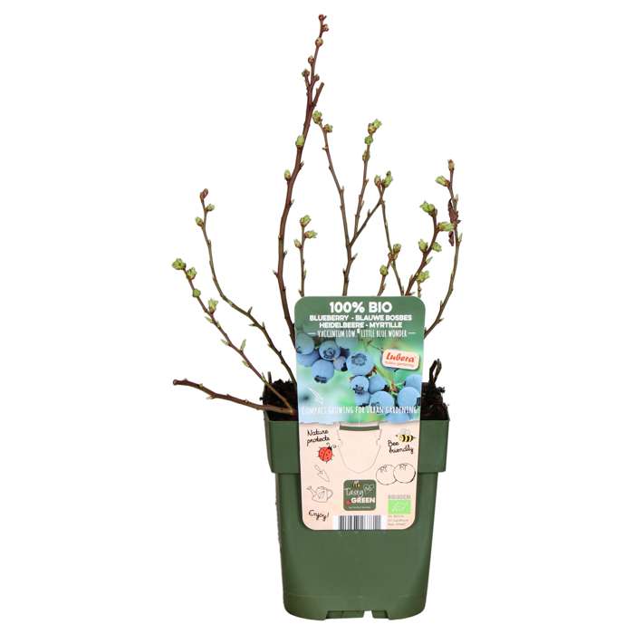 Vaccinium Little Blue Wonder‘ ist auch als Heidelbeere oder amerikanische Blaubeere bekannt. Die ‚Little Blue Wonder‘ ist eine der kompaktesten Heidelbeeren, die Pflanze wird nur etwa 50 cm hoch. Die Beeren sind recht klein, haben aber einen angenehm frischen Geschmack und eine schöne himmelblaue Farbe. Man kann sie direkt vom Strauch essen, aber sie eignen sich auch sehr gut für die Verwendung in Marmelade, Kuchen oder Saft. Die Pflanze bevorzugt einen sonnigen bis halbschattigen Standort und benötigt zum Wachsen einen sauren Boden. Andernfalls wird die Pflanze kaum Früchte tragen oder sogar absterben. Die Heidelbeere blüht im Mai mit weiß-rosa Blüten, aus denen sich Beeren entwickeln. Der Beginn der Erntezeit ist im Juli. Im Herbst verfärben sich die Blätter in ein schönes Rot, danach verliert sie ihre Blätter. Die blauen Beeren enthalten Anthocyane, eine Substanz, die der Beere ihre blaue Farbe verleiht. Dieser Stoff hat eine gute Wirkung auf das Herz und die Blutgefäße. Der Farbstoff kann u. a. dafür sorgen, dass Fettansammlungen in den Blutgefäßen reduziert werden, was die Durchblutung verbessert. Darüber hinaus enthalten Heidelbeeren Antioxidantien. Diese spielen eine wichtige Rolle im Alterungsprozess. Kurzum, eine supergesunde Beere, die jeder in seinem Garten haben möchte!