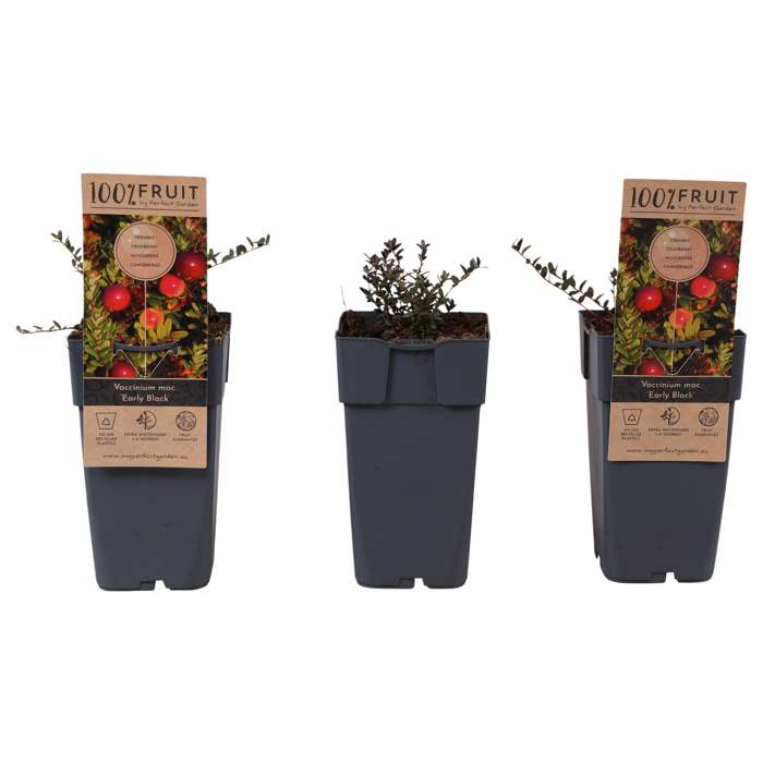 Vaccinium Macrocarpon Early Black‘ ist ein Preiselbeerstrauch. Diese Preiselbeere ist eine bodenbedeckende, niedrig wachsende Fruchtart mit dünnen Zweigen und feinen Blättern, die auch im Winter grün bleiben. Sie wächst am besten an einem sonnigen Standort, aber auch Halbschatten ist möglich. Die Pflanze benötigt einen feuchten Boden, da sie keine Trockenheit verträgt. Im Juni und Juli erscheinen die rosa Blüten in Büscheln am Ende der Zweige. Die Beeren können ab Ende August gepflückt werden. Die ovalen, harten Beeren sind zunächst hellgelb und nehmen dann eine rote Farbe an. Sie schmecken frisch und sauer und werden daher am besten für Säfte, Püree und Konfitüren verwendet. Die roten Cranberries sind reich an Vitamin C und Antioxidantien und können einige Infektionen wie Blasen- und Harnwegsinfektionen verhindern. Die Pflanze benötigt wenig Rückschnitt. Ein guter Rückschnitt alle vier Jahre ist ausreichend. Dies fördert das Wachstum und die Beerenproduktion. Die Moosbeere verdankt ihren Namen dem gebogenen Stiel der Blüte, der an den Hals eines Kranichs erinnert. Der Name Cranberry wurde später zu Preiselbeere.
