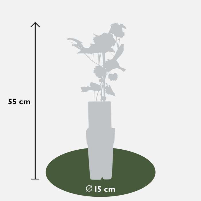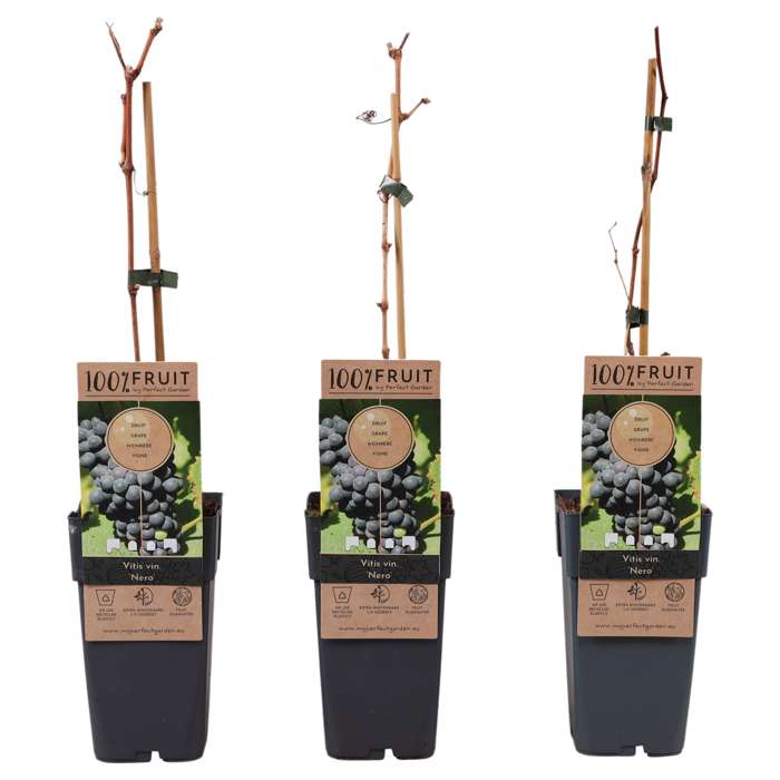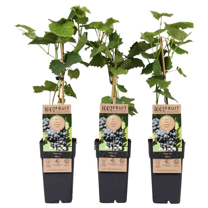 Vitis Vinifera Nero‘ ist eine blaue Traube, ideal für einen etwas trockeneren Standort und sehr resistent gegen Krankheiten. Sie ist eine Kletterpflanze, die mehrere Meter hoch werden kann. Man kann ihn in alle möglichen Formen bringen und ihn durch guten Schnitt sehr kompakt halten. Sie können die Traube einfach entlang einer Pergola oder an einer Wand mit Spanndrähten führen. Die Traube bildet im Mai-Juni zunächst unscheinbare Blütentrauben aus, aus denen sich dann die Trauben bilden. Die Früchte sind blau und haben einen süßen, aromatischen Geschmack. Man kann sie direkt essen oder zu Marmelade, Saft oder Wein verarbeiten. Die Traubenpflanze braucht viel Sonne, um zu reifen, und liebt die Wärme, so dass ein nach Süden ausgerichteter Standort ideal ist. Die Trauben können ab Mitte September geerntet werden. Der Boden sollte gut durchlässig und nährstoffreich sein und möglichst nicht zu sauer, sondern eher kalkhaltig. Durch das Beschneiden wird der Fruchtertrag erhöht und die Pflanze sieht auch gepflegter aus. Am besten ist es, die Pflanze zwischen November und Februar zu beschneiden, aber nicht bei strengem Frost. Überflüssige Seiten- und Hauptäste beschneiden. Diese Rebsorte ist widerstandsfähig und kann Temperaturen von bis zu -20 Grad standhalten.