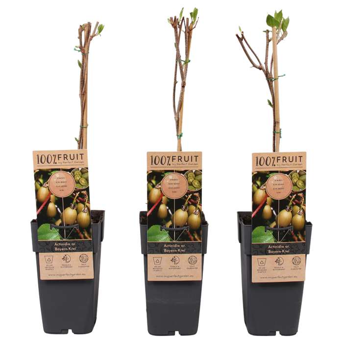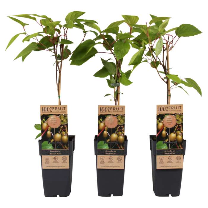 Actinidia arguta Bayern Kiwi’ is a kiwi grape that produces small, smooth, hairless fruits at a young age. It is also known as mini-kiwi. This plant is a female variant of the kiwi grape. When this plant is pollinated by a male variant, it produces fruit. The fruits of the kiwi grape are a lot smaller than those of the large kiwi plants. The skin of these kiwi grapes is smooth and thin and therefore easy to eat. They hang in large bunches from the plant, often camouflaged between the leaves. The cut fruit resembles a miniature kiwi, with a white core surrounded by a ring of black seeds and the typical pattern of lines. The sweet, dark-green berries with a beautiful red blush are ready for picking in September-October and are about 3 cm in size. Besides being fresh, the fruits can also be processed in various ways, such as jam or compote. The sliced fruits are also beautiful as a garnish for appetizers or desserts. The fruits are also dried and can even be used to make wine. The kiwi grape is a climbing plant and therefore you can best help it by guiding it along a wall, climbing frame or pergola. The kiwi grape flowers in May-June with fragrant white flowers. It is fully winter Hardy and can tolerate temperatures up to -25 °C. Plant the kiwi plant in a sunny, somewhat sheltered spot.