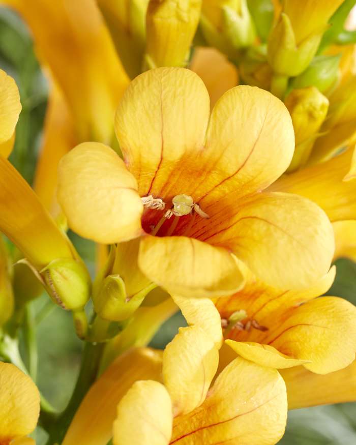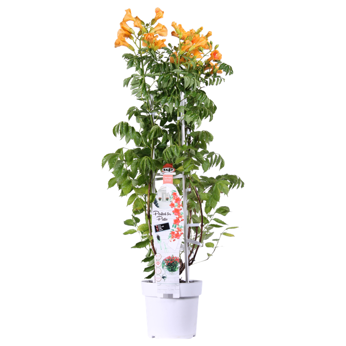 Campsis Summer Jazz Gold Trumpet’ is a Chinese trumpet that flowers abundantly and for a longer time when there is a lot of sun. The Chinese trumpet is very Hardy if placed in a sheltered spot. The yellow-flowered Campsis grows more compactly than other species in the Summer Jazz series, to a maximum height of 3 metres. The late-summer bloomer tends to form a shrub. If you want your Campsis to climb, it is useful to support it with a climbing frame at the beginning of its growth. This Campsis is a self-adhesive climber, which means that small adhesive roots are formed from the branches. These adhesive roots will attach themselves along the wall or fence. In August and September you can expect exotic flowers that will give your outdoor area a Mediterranean atmosphere. The flowers are very popular with butterflies, bees and insects.