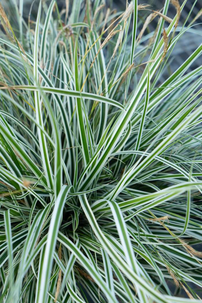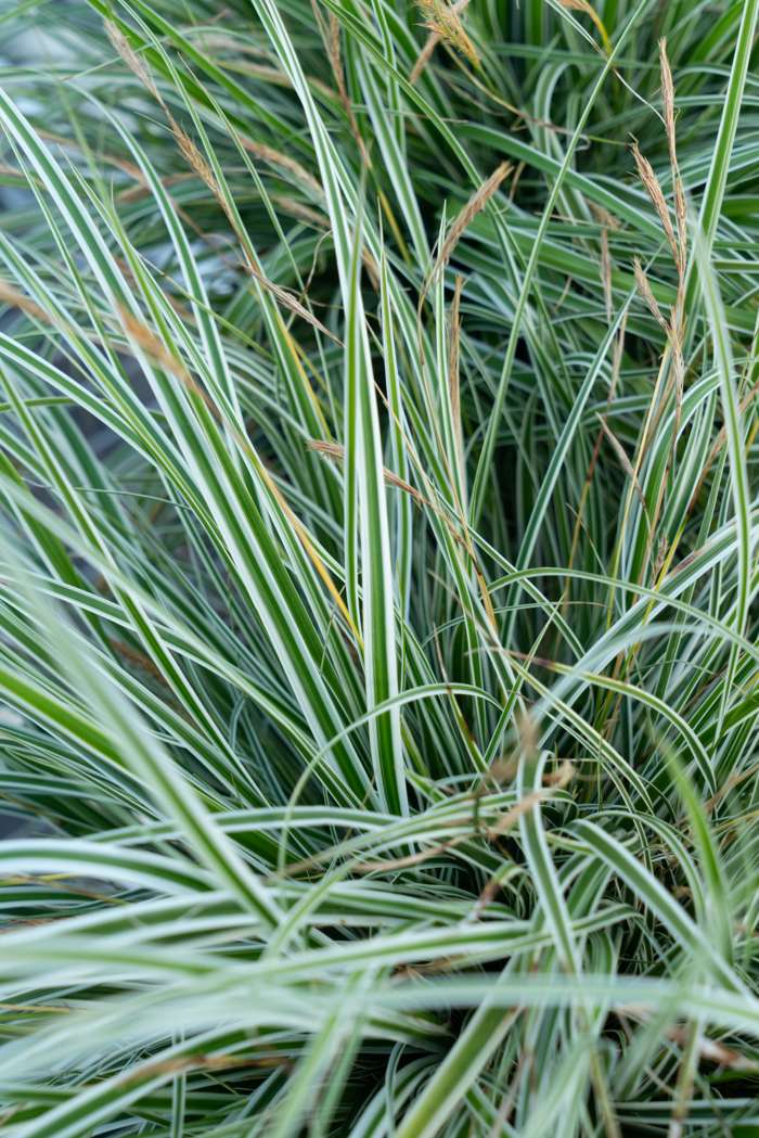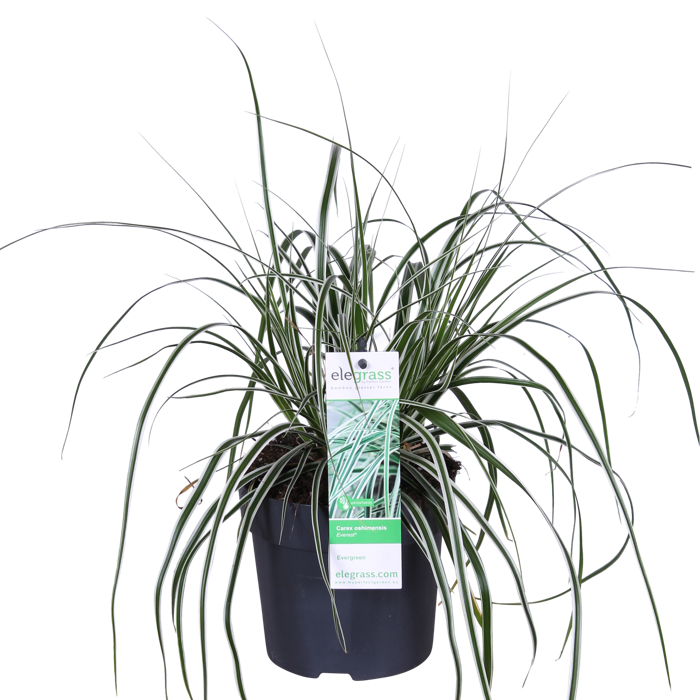Carex oshimensis ‘Everest’, also known as Sedge, is an evergreen ornamental grass with green and white striped leaves that hang over beautifully. From April to June, the grass flowers with golden-brown panicles. Sedge is a strong plant that needs little care. It can be used as a ground cover, but is also suitable to put in a nice pot or in a border. This ornamental grass combines well with other flowering plants.