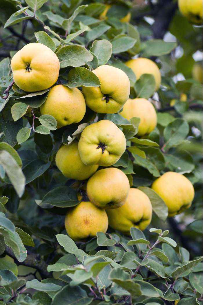 ‘Cydonia Oblonga Leskovacks’ is a quince that grows into a small tree with a striking flowering. The quince is a fruit that looks like a cross between an apple and a pear. It is often a little lumpy and has an irregular shape. The quince has a yellow skin and is white inside. Quinces are not tasty raw because of their hard and sour flesh. The quince is therefore processed into compote, jam, jelly, fruit juice or tea. The quince is related to the rose and therefore the fruits have a very aromatic smell. The tree flowers in May and June with light pink flowers and the fruit can be harvested in September and October. The leaves are oval shaped and have an olive-green colour. In autumn the leaves change to a striking yellow hue. The best soil for the quince is moist and needs sufficient sun to grow best.