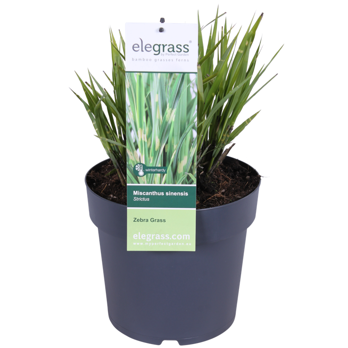 Miscanthus Sinensis Strictus’ is a decorative grass with upright growth and striking playful green-yellow cross-striped leaves. Because of the stripes its nickname is also zebra grass. This ornamental grass flowers with bronze-coloured plumes in late summer. It is a strong grower, which is suitable for both full soil and in a decorative pot. The Miscanthus Sinensis ‘Strictus’ is Hardy, but does lose its leaves. In March you can cut back the plant to 10 cm above the ground, after which it will sprout again. You can place this grass in full sun to semi shade. It grows best in humus-rich soil, but has few demands.