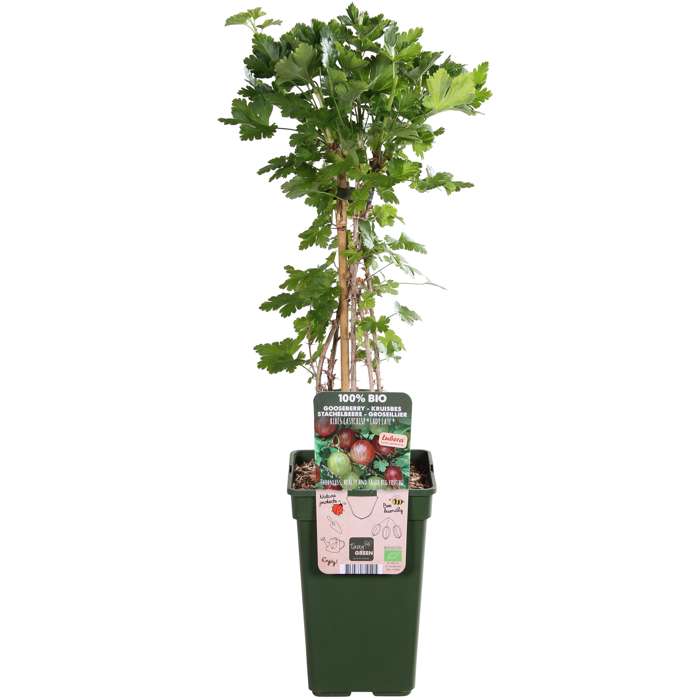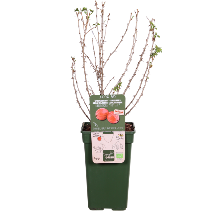 ‘Ribes Easycrisp Lady Late’ is a gooseberry that produces fresh sweet fruits. The advantage of this shrub is that it has fewer prickles on the branches compared to other gooseberry species. This makes it easier to pick the fruit. This red gooseberry blossoms in April with green-white flowers and around July the fruits are ready to be picked. The fruits are extra large, round and dark red. It is not a common shrub to grow at home, but it is a very easy plant for the starting fruit gardener or for children who like gardening. The gooseberry is good for making jam or wine. In the winter, this bush loses its leaves and that is the best time for pruning. Without leaves, the bush can best be seen and so you can prune it back into the desired shape. This red gooseberry prefers a spot in the sun in soil that is not too damp. Gooseberries need support to grow. It is therefore advisable to tie the stems along a climbing frame or mesh.