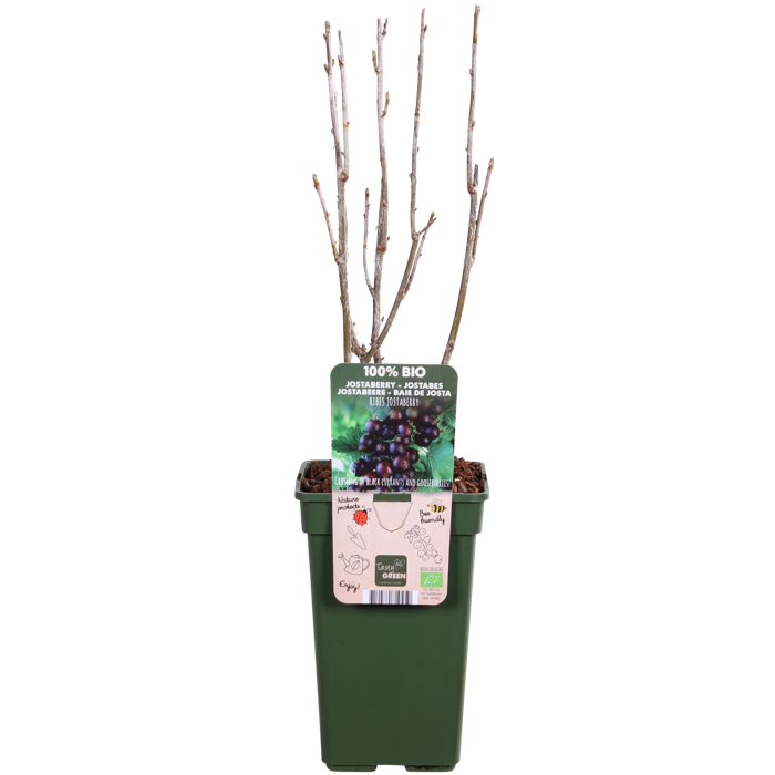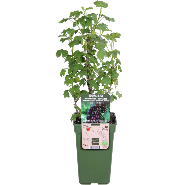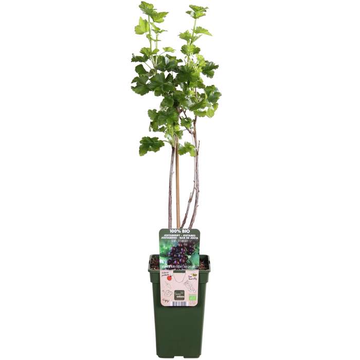 ‘Ribes Jostaberry’ is a cross between Black currant and gooseberry. The berries are slightly larger than those of Black currant and taste even better, so this shrub deserves a place in every fruit garden. It is a thornless shrub that can grow up to 2 metres high. The ‘Jostaberry’ flowers in May and June with small and inconspicuous green-yellow flowers. The ripe berries look shiny black and taste like sweet Black currant. The berries are small, about 1.5 cm in size and can be picked between July and August. It is best to harvest the ‘Jostaberry’ when it is fully ripe. The berries hang in small bunches of 3 to 5. Birds also love these berries, so try to protect your bush from them! The shrub is very winter Hardy and in the first years you do not need to prune it, just remove the dead branches.