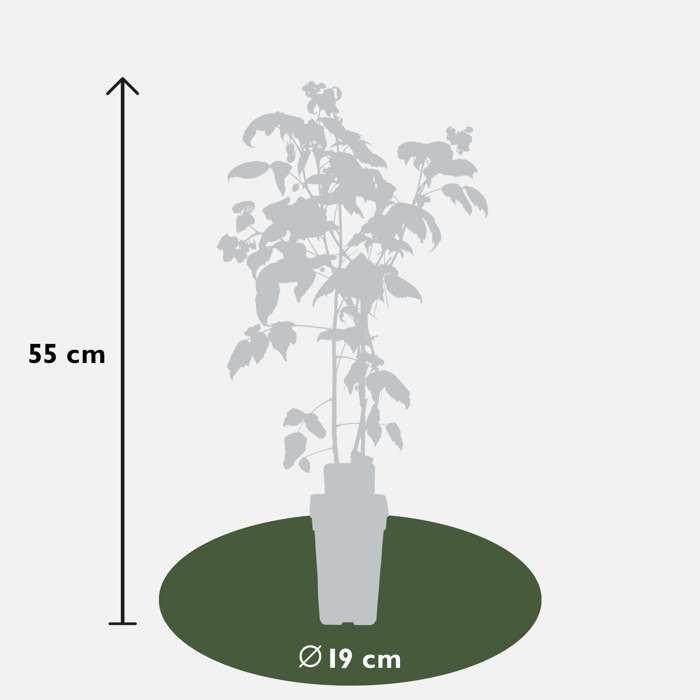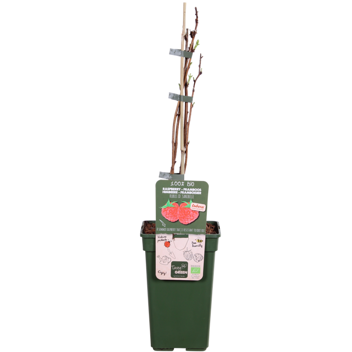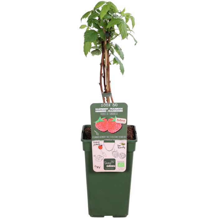 ‘Rubus Sanibelle’ is a strong growing summer raspberry. The raspberries are large in size, nice dark red in colour and deliciously sweet. This raspberry is self-pollinating and flowers in May with inconspicuous, small white-pink flowers that attract bees and bumblebees. After flowering, the raspberries develop. They can be eaten straight from the bush, but you can also make delicious jam and juice from them. Raspberries are often very expensive in the shops, so it is much more fun to grow them yourself! Raspberries only develop a branch the first year, which will bear fruit the following year. After the harvest, the branches that have borne fruit can be cut close to the ground. The young branches will flower the following year and then bear fruit. This raspberry loses its leaf in the autumn. The raspberry needs support to grow well, so always place it against a climbing frame. It also likes a sunny spot.