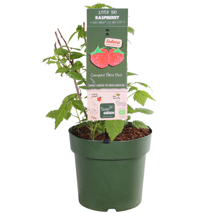 Rubus Low. Little Sweet Sister’ is a compact growing dwarf raspberry and grows up to 100 cm high. It is therefore very suitable for your terrace or balcony. The raspberries are of medium size, beautiful dark red in colour and deliciously sweet. This raspberry is one of the first to ripen, already in May. This raspberry is self-pollinating and flowers in April with inconspicuous, small white-pink flowers that attract bees and bumblebees. After flowering, the raspberries develop. They can be eaten straight from the bush, but you can also make delicious jam and juice from them. Raspberries are often very expensive in the shops, so it is much more fun to grow them yourself! Raspberries only develop a branch the first year, which will bear fruit the following year. After the harvest, the branches that have borne fruit can be cut close to the ground. The young branches will flower the following year and then bear fruit. The raspberry needs support to grow well, so always place it against a climbing frame. It also likes a sunny spot.