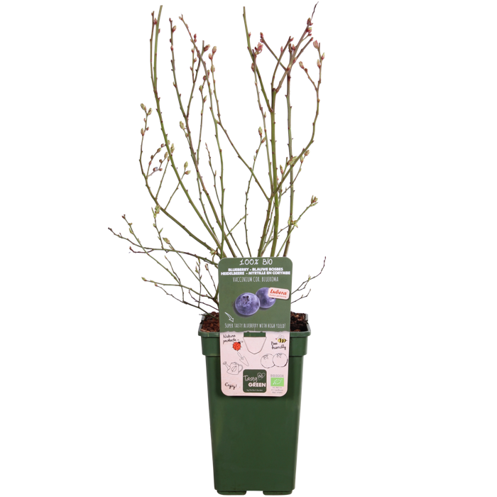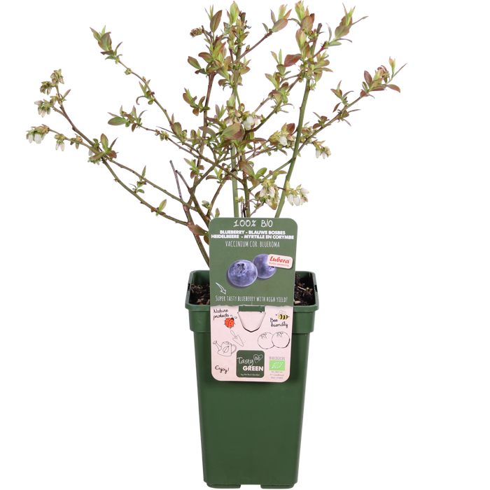 ‘Vaccinium corymbosum Blue Roma’ is a blueberry, also called American blueberry. It grows to a height of about 100 cm with very large and dark blue fruits. It only grows in acid soil, sandy soil and peaty soil are suitable for this plant. If you want to place the plant in clay soil, you will have to add acidic soil in order for the plant to survive. It has thin branches and small fresh-green leaves. The blueberry blooms in clusters and the flower is white-cream to pink in colour. Flowering takes place in the first half of May. It is a strong plant and gives quite a lot of fruits. The berries are large, dark blue, firm and have a delicious taste. They contain many antioxidants, so super healthy! They can be picked from mid-July to mid-August. Fresh blueberries can be kept for a week, but you can also freeze them. This plant is completely self-pollinating and requires almost no care. Protect the berries from birds with a net. The plant is Hardy and resistant to diseases.