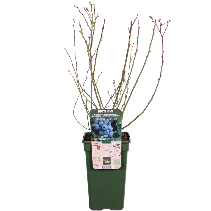‘Vaccinium corymbosum Brigitta Blue’ is an American blueberry, also known as blackberry. The shrub has thin branches and small fresh green leaves. The fruits are firm, light blue with a good taste. They can be picked from mid-July to mid-August. Fresh blueberries can be kept for a week and you can also freeze them. The blueberry blooms in clusters and the flower is white-cream to pink in colour. Flowering takes place in the first half of May. This plant is completely self-pollinating and requires almost no care. The berries are not very attractive to birds, but sometimes covering the plants may still be necessary. Brigitta Blue’ is a species that does well in almost all soil types. Blueberries have medicinal properties. The berry contains anthocyanin, a substance that gives the berry its blue colour. This substance has a good effect on the heart and blood vessels. The colouring can, among other things, ensure that fat accumulation in the blood vessels is reduced, thus improving the blood circulation. In addition, blueberries contain antioxidants. These play an important role in the ageing process. Antioxidants are anti-inflammatory, cholesterol-lowering and protect against various diseases, such as cancer. There are few foods that contain more antioxidants than blueberries. A super healthy berry!