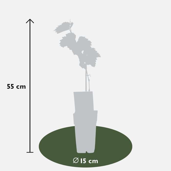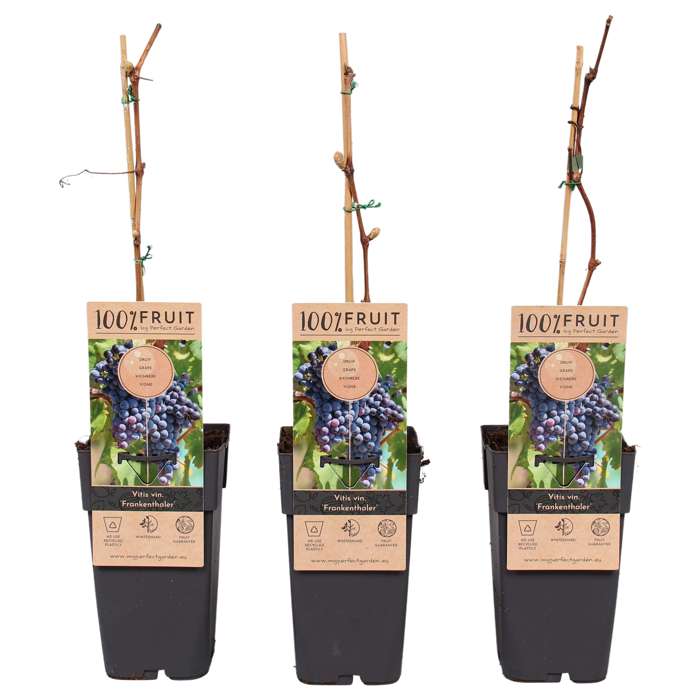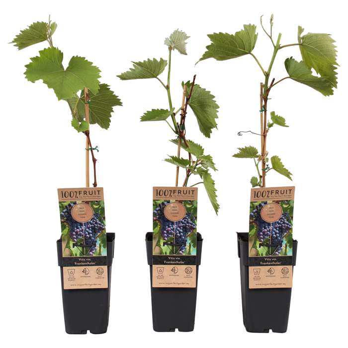 Vitis Frankenthaler’ is a blue grape. Because of its early flowering and the amount of sun and warmth it needs, it is better grown in a greenhouse to give a good harvest. It is a climbing plant that can grow several metres high. You can lead it into all kinds of shapes and keep it very compact by pruning it well. You can easily lead the grape along a pergola or on the wall with tension wires. The grape first produces inconspicuous clusters of flowers in April-May, after which the grape bunches will form. The fruits are red-blue, sweet, juicy with a good aroma. You can eat them directly or use them to make jam, juice or wine. The grape plant needs a lot of sun to ripen and loves heat so a south-facing location is ideal. The grapes can be harvested from mid-September onwards. The soil should be well-drained and nutritious and preferably not too acidic, but rather calcareous. Pruning increases the fruit yield and the plant also looks neater. It is best to prune the plant in the period between November and February, but not during severe frost. Prune superfluous side and main branches. This grape variety is Hardy and can withstand temperatures up to -20 degrees.