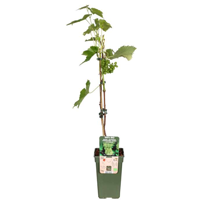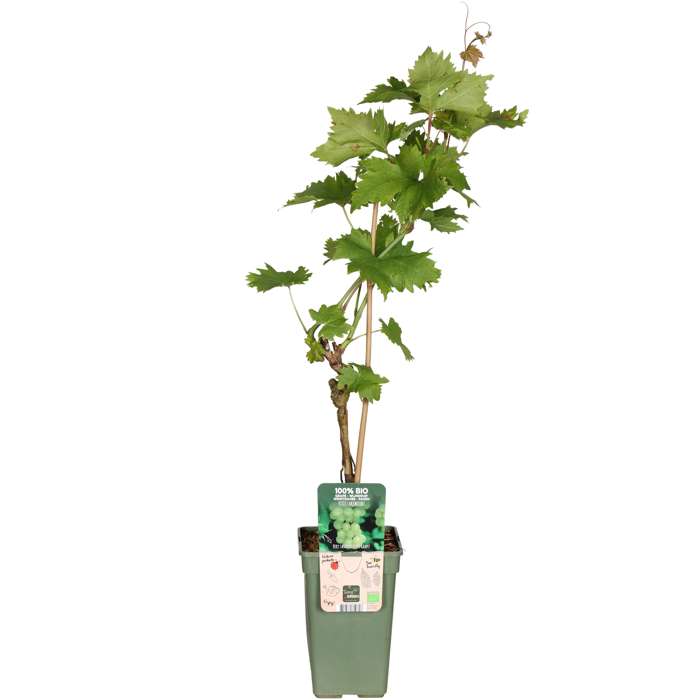 ‘Vitis Lakemont’ is a white seedless grape that is suitable as a table grape, but also as a wine grape. Table grape means when the fruit is suitable for fresh consumption. It is a climbing plant that can grow several metres high. You can lead it into all kinds of shapes and keep it very compact by pruning it well. You can lead the grape well along a pergola or on the wall with tension wires. The grape first produces inconspicuous clusters of flowers in July-August, after which the grape bunches will form. The fruits are green-yellow in colour, juicy with a sweet taste. You can eat them directly or use them to make jam, juice or wine. The grape plant needs plenty of sun to ripen and loves heat so a south-facing location is ideal. The grapes can be harvested from mid-September onwards. The soil should be well-drained and nutritious and preferably not too acidic, but rather calcareous. Pruning increases the fruit yield and the plant also looks neater. It is best to prune the plant in the period between November and February, but not during severe frost. Prune superfluous side and main branches. This grape variety is Hardy and can withstand temperatures up to -20 degrees without problems.