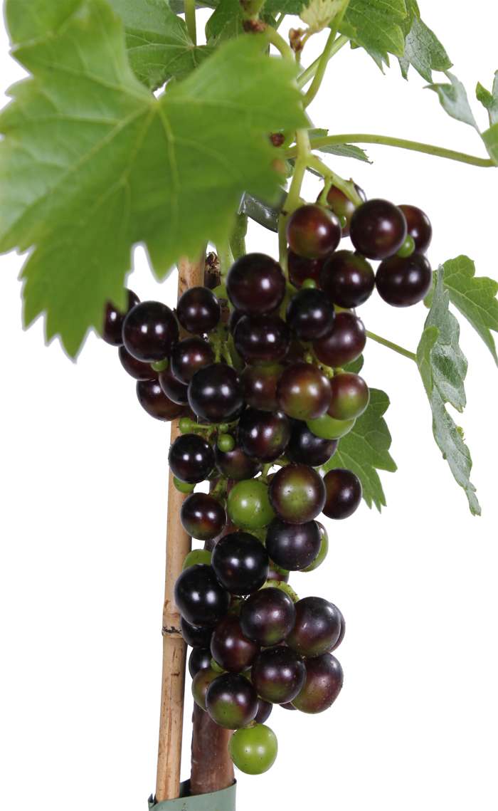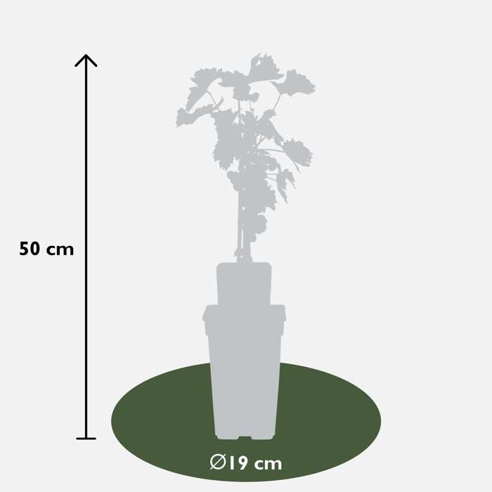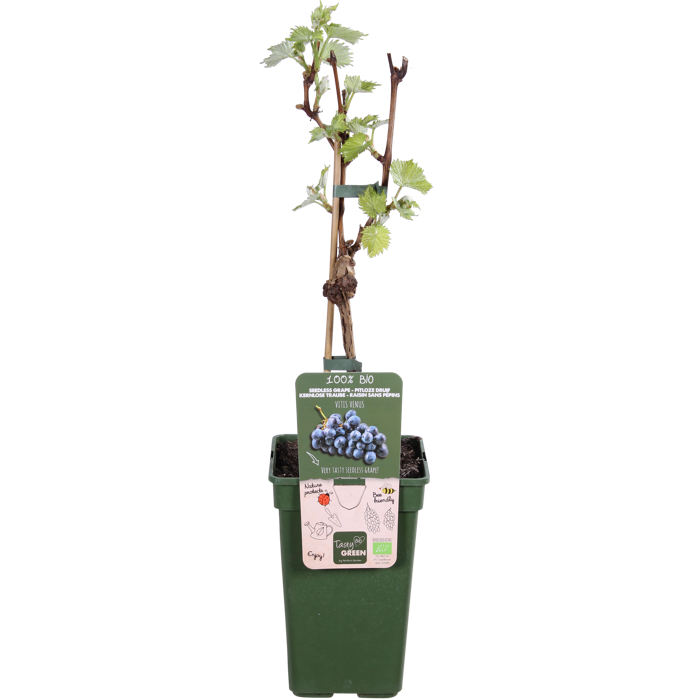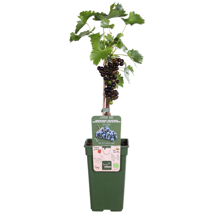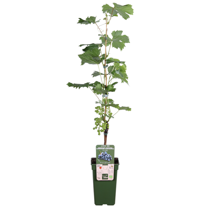 ‘Vitis Venus’ is a seedless blue grape, suitable both for fresh consumption and as a wine grape. This variety has extra large fruits and is therefore a very good wine grape. It is a climbing plant that can grow several metres high. You can lead it into all kinds of shapes and keep it very compact by pruning it well. You can easily lead the grape along a pergola or on the wall with bungee cords. The grape first produces inconspicuous clusters of flowers in May-June, after which the grape bunches will form. The fruits are blue, with a sweet aromatic taste. You can eat them directly or use them to make jam, juice or wine. The grape plant needs plenty of sun to ripen and loves heat so a south-facing location is ideal. The grapes can be harvested from mid-September onwards. The soil should be well-drained and nutritious and preferably not too acidic, but rather calcareous. Pruning increases the fruit yield and the plant also looks neater. It is best to prune the plant in the period between November and February, but not during severe frost. Prune superfluous side and main branches. This grape variety is Hardy and can withstand temperatures up to -20 degrees.
