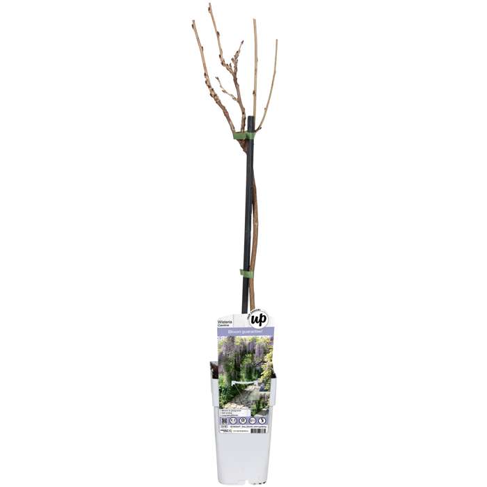 ‘Wisteria sinensis Caroline’ also known as wisteria is a climbing plant with beautiful, very long, dark blue-purple coloured flower clusters that appear en masse in May-June. There may also be an after flowering in September. It is a fast-growing climber that can reach a maximum height of 10 metres. To keep the wisteria in the best possible shape, it is best to lead it along a pergola, fence or rack. Make sure there is a solid support, to which the branches are attached so that it can climb towards the sun. It is also important to prune the plant regularly during its growth or in early spring. Prune preferably twice a year. In early spring, when the plant is leafless, cut away all superfluous branches up to about three eyes. The eyes on the side branches will later produce flowers. In the summer, when the plant is growing vigorously, it is best to guide the long shoots in the direction you want. If you do not need them, it is best to remove them. If you keep your Wisteria compact and give it a sunny spot, it will bloom even more abundantly with wonderfully fragrant flower clusters in the spring. With good care, the wisteria can even live for hundreds of years. Older trunks take on a decorative, twisted shape. Be patient with this beautiful climbing plant, it can take a few years for the wisteria to flower properly.