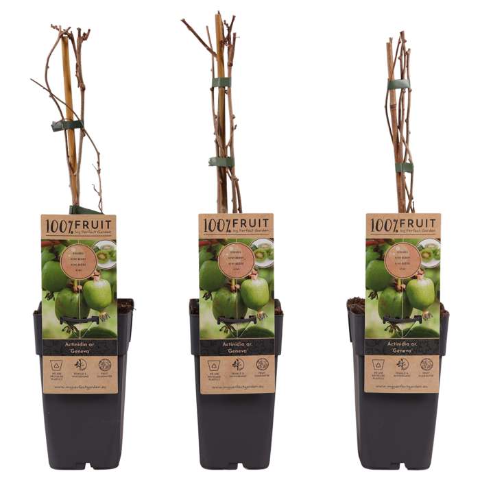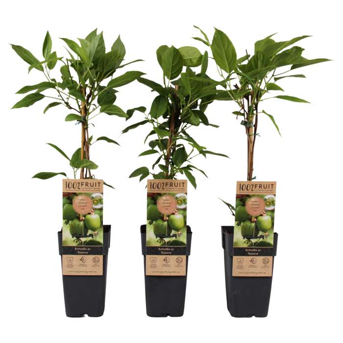 ‘Actinidia arguta Geneva’ is een kiwibes die al op jonge leeftijd kleine, gladde, haarloze vruchtjes geeft. Hij is ook wel bekend onder de naam mini-kiwi. Deze plant is een vrouwelijke variant van de kiwibes. Wanneer deze plant door een mannelijke variant bestoven wordt, komen er vruchten aan deze plant. De vruchten van de kiwibes zijn een stuk kleiner dan die van de grote kiwiplanten. De schil van deze kiwibessen is glad en dun en kan daardoor prima gegeten worden. Ze hangen in grote trossen aan de plant, vaak gecamoufleerd tussen het blad. De opengesneden vrucht doet denken aan een miniatuur kiwi, een witte kern met daaromheen een ring van zwarte zaden en het typische lijnenpatroon. De zoete, roodbruin- groen gekleurde vruchten zijn klaar om geplukt te worden in september- oktober en zijn zo’n 3 cm groot. Behalve vers, kunnen de vruchten ook op verschillende manieren verwerkt worden, zoals jam of compote. Ook zijn de doorgesneden vruchtjes fraai als garnering bij hapjes of desserts. De vruchten worden ook wel gedroogd en er kan zelfs wijn van worden gemaakt. De kiwibes is een klimplant en daarom kan je hem het beste helpen door hem te leiden langs een muur, klimrek of pergola. De kiwibes bloeit in mei-juni met geurende witte bloemen. Hij is volledig winterhard en kan temperaturen tot -25 °C goed verdragen. Plant de kiwiplant op een zonnige, enigszins beschutte plek.