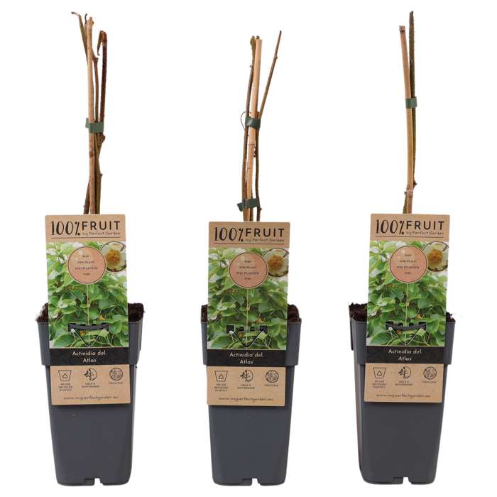 Actinidia deliciosa Atlas’ is een decoratieve mannelijke kiwiplant. Kiwi’s geeft deze plant niet maar wel goed stuifmeel waarmee vrouwelijke kiwi-rassen bestoven worden zoals de Actinidia deliciosa ‘Jenny’ of ‘Hayward’. Deze soort is daarom vooral geschikt om bij andere soorten de bestuiving te bevorderen en zo een bijdrage te leveren aan betere vruchten. De plant heeft in mei-juni mooie witte bloemen. Het is een snel groeiende slingerende klimplant en kan het beste tegen een klimrek, schutting of pergola geplaatst worden. De plant kan ook in een pot op het balkon of terras gezet worden. De kiwiplant overleeft goed in ons klimaat en is winterhard tot -12° C. Wanneer de plant nog niet volwassen is kan je in de winter met strenge vorst het beste de plant afdekken. De kiwiplant heeft een warme en zonnige standplaats nodig. De groei van deze tuinplant is uitermate sterk. Regelmatig snoeien voorkomt een rommelig groeiende plant en stimuleert bovendien de bloemzetting.