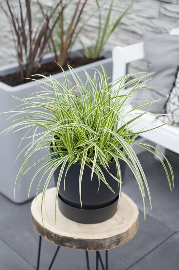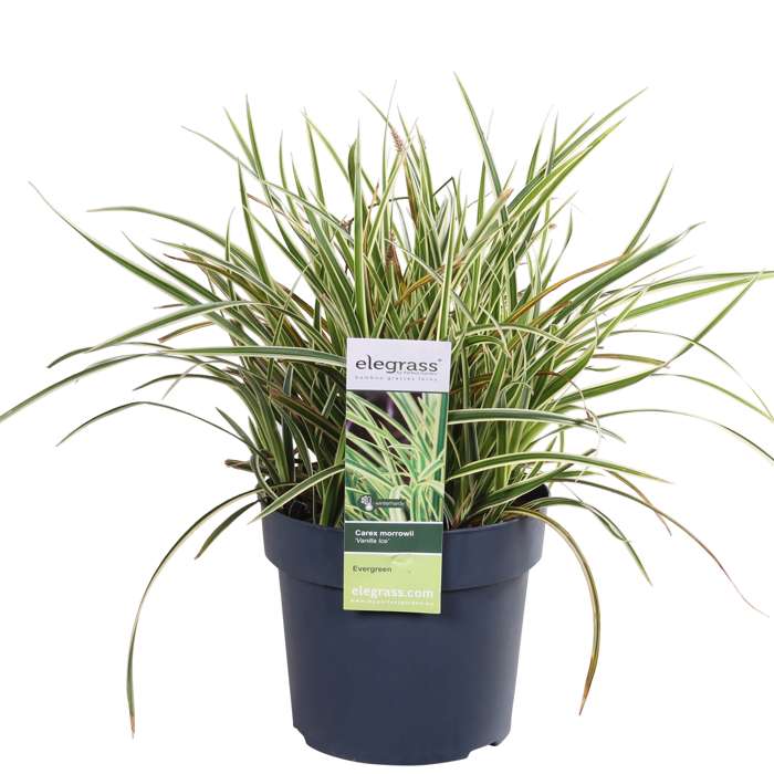 ‘Carex Vanille Ice Cream’, ook wel Zegge, is een wintergroen siergras. Dit wil zeggen dat de plant in de winter ook zijn blad behoudt. Dit is de reden dat de Carex al jaren een van de populairste siergrassen is. De Zegge heeft groene bladeren met geel gekleurde rand. Uiteindelijk wordt de Zegge maximaal 35 cm hoog en is een niet woekerend soort. In mei en juni bloeit de Zegge met lichtbruine aren die net boven het blad uitsteken. Hij is geschikt voor de tuin maar juist ook voor op het balkon of terras. Dit siergras combineert mooi met andere bloeiende planten. We adviseren wel de Carex eens in de zoveel tijd een snoei beurt te geven. Dit doe je door in het vroege voorjaar de bruin geworden toppen weg te knippen tot 10 cm boven de grond. Het is niet per se nodig, maar je voorkomt dat oudere sprieten bruine vlekken krijgen. Na het terugknippen loopt deze soort weer fris uit en is jouw Carex mooier dan ooit!