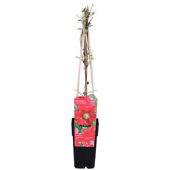 Clematis Ernest Markham’ is een rijkbloeiende Bosrank met rozerode bloemen. Deze verschijnen in grote getale tijdens de zomermaanden van juli tot september. De Bosrank is een zeer winterharde plant, die de Nederlandse winters uitstekend kan verdragen. Het is belangrijk om in het voorjaar de plant terug te snoeien tot op zo’n 40-50 cm hoogte. In een aantal maanden zal de plant dan weer helemaal groeien tot een hoogte van wel 2 tot 2,5 meter. Het is een klimplant die wat hulp nodig heeft bij het klimmen. Het beste kun je de plant dan ook langs een rek, draad of stok omhoog leiden. De Clematis doet het dus zowel in de halfschaduw als in de zon erg goed. Dit maakt de Clematis geschikt voor de meeste plekken in je tuin, erg handig! Bij meer zon zal de clematis wel rijkelijker bloeien. De wortels van de Clematis moeten wel in de schaduw en koelte staan. Zorg dat er altijd iets voor de voet van de plant groeit en plant de clematis dieper in de grond.