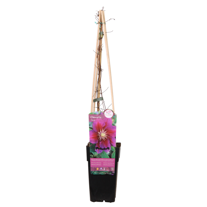 ‘Clematis Hania’ is een grootbloemige clematis met roze-rode bloemen. Deze bloemen verschijnen rond mei- juni en de clematis bloeit door tot september. De clematis is winterhard, maar wel bladverliezend. Snoeien van deze plant is niet noodzakelijk maar kan wel als hij bijvoorbeeld te groot wordt. Doordat deze grootbloemige clematis vrij vroeg bloeit is het aan te raden pas na de bloei te snoeien. Om de clematis beter te laten klimmen heeft hij een beetje hulp nodig. Het beste kun je de plant dan ook langs een rek, draad of stok omhoog leiden. De clematis doet het dus zowel in de halfschaduw als in de zon erg goed. Dit maakt de clematis geschikt voor de meeste plekken in je tuin, erg handig! Bij meer zon zal de clematis wel rijkelijker bloeien. De wortels van de clematis moeten wel in de schaduw en koelte staan. Zorg dat er altijd iets voor de voet van de plant groeit en plant de clematis dieper in de grond. Zo wordt hij beschermd tegen de vervelende verwelkingzziekte die de bovengrondse stengels kan aantasten, onder de grond blijft de plant gezond.