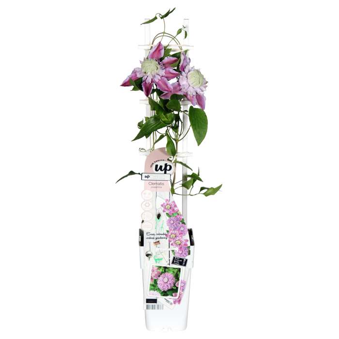 ‘Clematis Josephine Regal’ is een grootbloemige bosrank en bloeit met dubbele lilaroze bloemen. Het is een zeer gezonde en onderhoudsvriendelijke plant. De bloemen ontvouwen zich mooi vanuit een centrale bal en creëren zo een elegante pom-pom. De bloei van mei tot september. Het is een klimplant die wat hulp nodig heeft bij het klimmen. Het beste kun je de plant dan ook langs een rek, draad of stok omhoog leiden. De clematis doet het zowel in de halfschaduw als in de zon erg goed. Dit maakt de clematis geschikt voor de meeste plekken in je tuin. Bij meer zon zal de clematis wel rijkelijker bloeien. Snoeien is niet noodzakelijk. Verwijder echter wel de dode en beschadigde twijgen. Je kan de plant het beste snoeien na de bloei in het najaar.