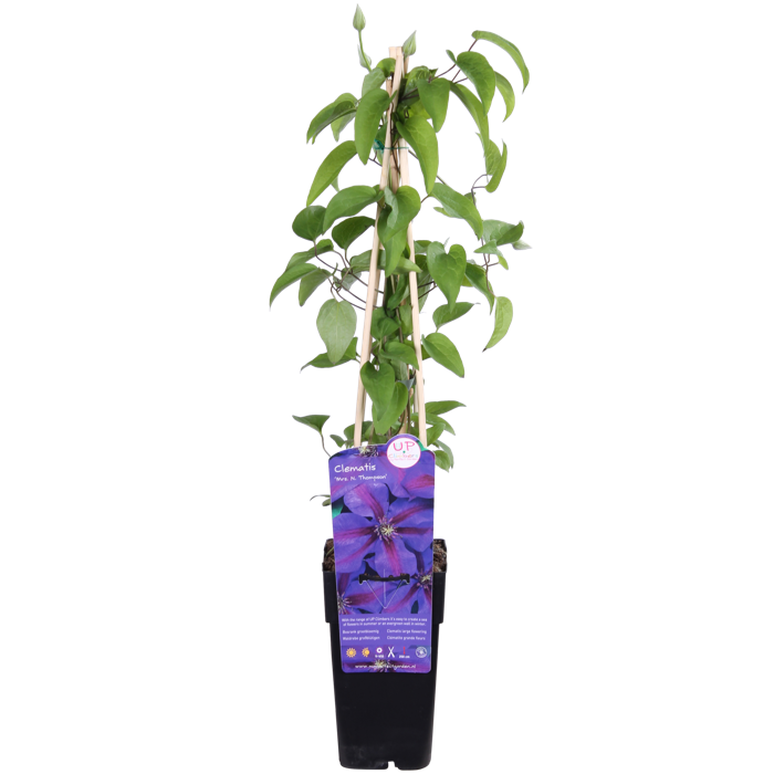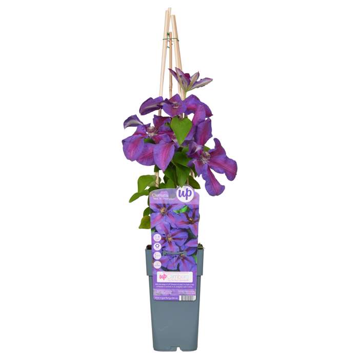 ‘Clematis Mrs. N. Thompson’ is een rijkbloeiende Bosrank met grote paarse bloemen welk een purperrode streep in het midden van het bloemblad hebben. De bloemen verschijnen in grote getale tijdens de zomermaanden, van juli tot september. De Bosrank is een zeer winterharde klimplant. Deze kan de Nederlandse winters dus uitstekend kan verdragen. Het is belangrijk om in het voorjaar de plant terug te snoeien tot op zo’n 40-50 cm hoogte. In een aantal maanden zal de plant dan weer helemaal uitlopen tot een hoogte van 2 tot 2,5 meter. Een groot voordeel van deze Bosrank is dat de plant zowel zon, halfschaduw als schaduw kan verdragen. Dit maakt een clematis geschikt voor de meeste plekken in je tuin, erg handig! Bij meer zon zal de clematis wel rijkelijker bloeien. Om de clematis beter te laten klimmen heeft hij een beetje hulp nodig. Het beste kun je de plant dan ook langs een rek, draad of stok omhoog leiden.