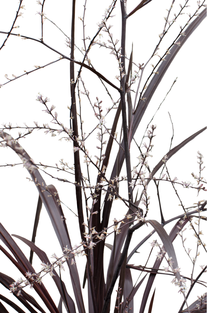 ‘Cordyline x Festival® Burgundy’ heeft heldere bordeauxrode bladeren die lang en smal zijn waardoor ze iets gebogen hangen. Ze hebben een stoere, leerachtige textuur. In de zomer verschijnen er kleine witte bloemen tussen de donkerrode stengels. Het is een vorstbestendige, groenblijvende plant met een opgaande groeiwijze. Het heldere bordeauxrode blad zorgt voor een dramatisch en opvallend grasachtig effect. De ‘Cordyline’ komt van oorsprong voor in de subtropische delen van Nieuw-Zeeland, waar het groeit in kustgebieden, langs bosranden in hoge bergbossen en langs rivieroevers en moerassen. Het kan goed tegen droge en koude omstandigheden. Het is een geweldige, architectonische plant voor in een sierpot of in de tuin. De ‘Cordyline’ is ook bekend onder de naam Koolpalm of Geluksplant. De plant heeft verder geen speciale snoei of verzorging nodig. Verwijder alleen regelmatig oud blad zodat de plant een frisse uitstraling blijft hebben.