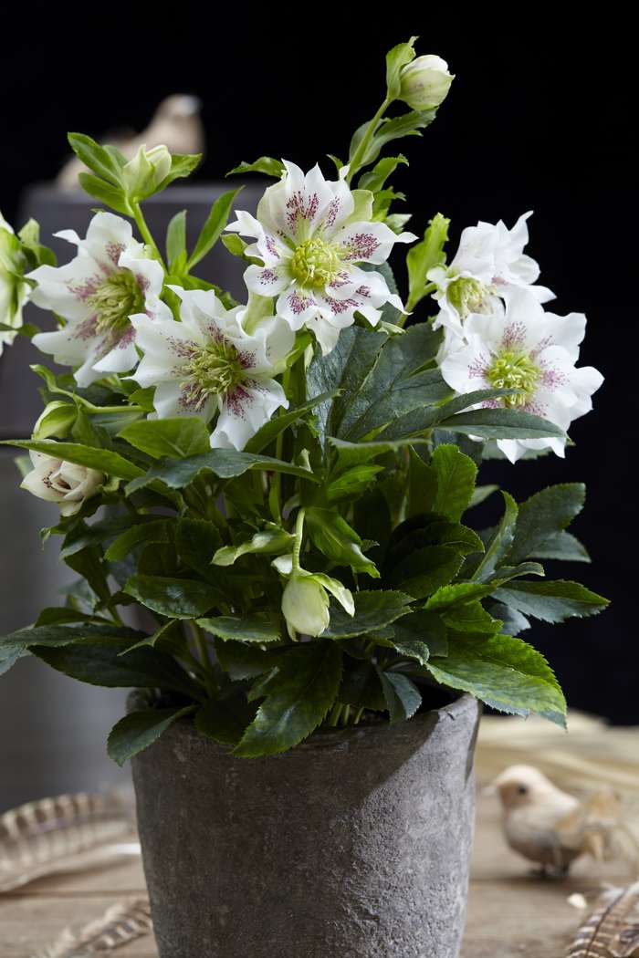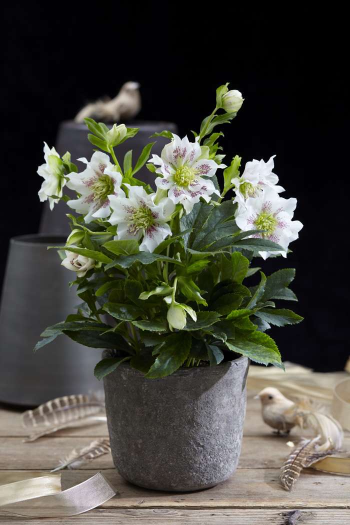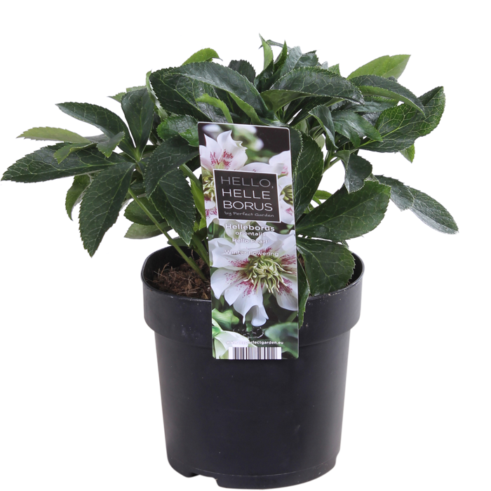 “‘Helleborus orientalis Hello Pearl’ ook wel lenteroos genoemd brengt in de winter en het vroege voorjaar kleur in je tuin of op het terras. Doordat de helleborus in de winter en het vroege voorjaar als een van de weinige planten bloeit, is deze ook aantrekkelijk voor de eerste bijen die ontwaken uit de winterslaap. De plant is zeer eenvoudig in gebruik zowel in de tuin als op het terras. De bloemen hebben witte tot roze bloembladeren die bezaaid zijn met roze of purper gekleurde spikkels en verschijnen van december tot april. Snoei de lelijke bladeren na de winter tot de grond af en de plant zal weer in het voorjaar uitlopen met nieuwe bladeren. Deze tuinplant staat niet graag in de volle zon, maar groeit goed op een plek met ochtend- en of avondzon. De helleborus staat het liefst op een beschutte plaats in een humusrijke, vochthoudende bodem en stelt weinig eisen aan de grondsoort