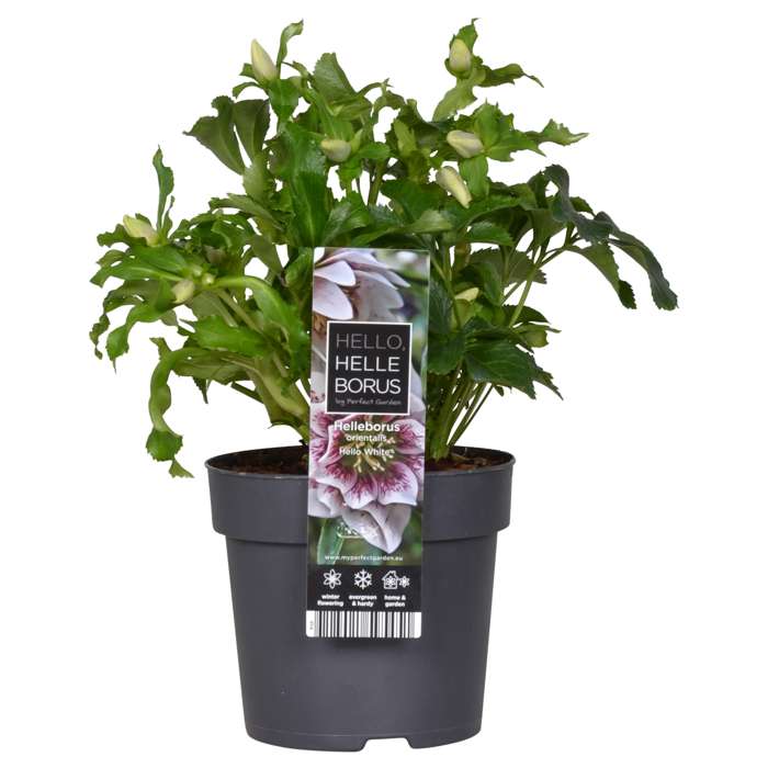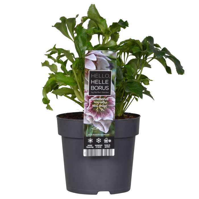 “‘Helleborus orientalis Hello White’ ook wel lenteroos genoemd brengt in de winter en het vroege voorjaar kleur in je tuin of op het terras. Doordat de helleborus in de winter en het vroege voorjaar als een van de weinige planten bloeit, is deze ook aantrekkelijk voor de eerste bijen die ontwaken uit de winterslaap. De plant is zeer eenvoudig in gebruik zowel in de tuin als op het terras. De helleborus bloeit met overwegend witte bloemen met in het hart een aantal donkerroze tot purperkleurige spikkels en verschijnen van december tot april. Snoei de lelijke bladeren na de winter tot de grond af en de plant zal weer in het voorjaar uitlopen met nieuwe bladeren. Deze tuinplant staat niet graag in de volle zon, maar groeit goed op een plek met ochtend- en of avondzon. De helleborus staat het liefst op een beschutte plaats in een humusrijke, vochthoudende bodem en stelt weinig eisen aan de grondsoort