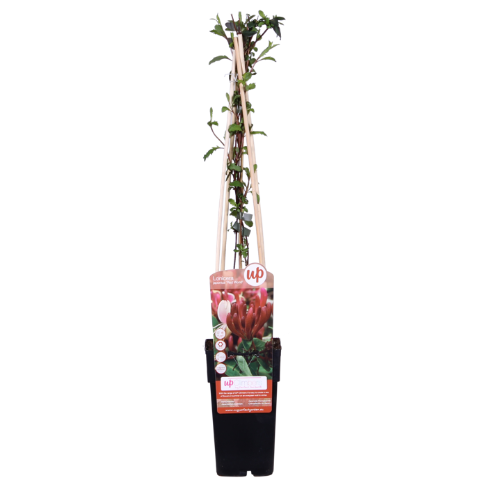 ‘Lonicera japonica Red World’ is een Japanse Kamperfoelie met prachtige heerlijk geurende rode buisvormige bloemen. Na de bloei verschijnen er rode bessen in de herfst, deze zij niet eetbaar. Deze Kamperfoelie is geschikt tegen een muur met een rek of voor over een pergola. Het is een uitbundige bloeier dus geeft extra veel kleur aan je tuin. Zorg voor schaduw aan de voet van deze tuinplant. Plaats bijvoorbeeld een dakpan boven de voet van de Lonicera of plant er een bodembedekker bij. De kamperfoelie groeit van oorsprong graag in bosranden waar de plant vanuit de koelte naar een lichte, warme plek klimt. De beste standplaats is dan ook in de halfschaduw-zon.