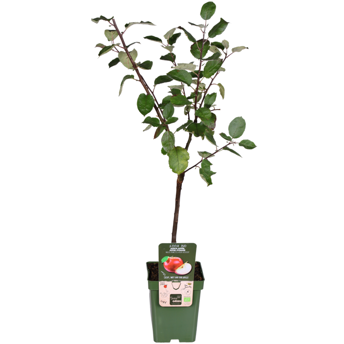 ‘Malus domestica Rode Boskoop’ is een appelboom die ook wel Goudreinet of Schone van Boskoop genoemd wordt. De appel heeft een doffe kleur en varieert van groen-geel tot bronsachtig met vaak een blos. Het is een redelijk vaste appel met een friszure, iets zoete smaak. De appel is vanwege zijn droge en wat ruwere schil minder populair als handappel. Doordat de appel zijn structuur en smaak behoudt bij het koken is hij juist wel een van de beste appels voor appeltaart of appelmoes. De appelboom bloeit in april met kleine witte bloemen. In september zijn ze rijp om te plukken. Deze appelboom zal uiteindelijk uitgroeien tot een echte boom, dus zorg ervoor dat hij genoeg ruimte heeft om zich te ontwikkelen. Al het fruit dus ook de appel, rijpt het beste in de zon. Geef deze fruitboom daarom een zo zonnig mogelijk plekje in de tuin. Fruitbomen goed snoeien is een vak apart, maar algemeen geldt dat er 3 of 5 hoofdtakken moeten blijven staan waaraan zijtakken met bloemen en vruchten kunnen groeien. Takken moeten elkaar bij voorkeur niet kruisen en de boom moet enigszins open blijven. Uiteraard zal de boom in iedere tuin een andere gewenste grootte hebben.