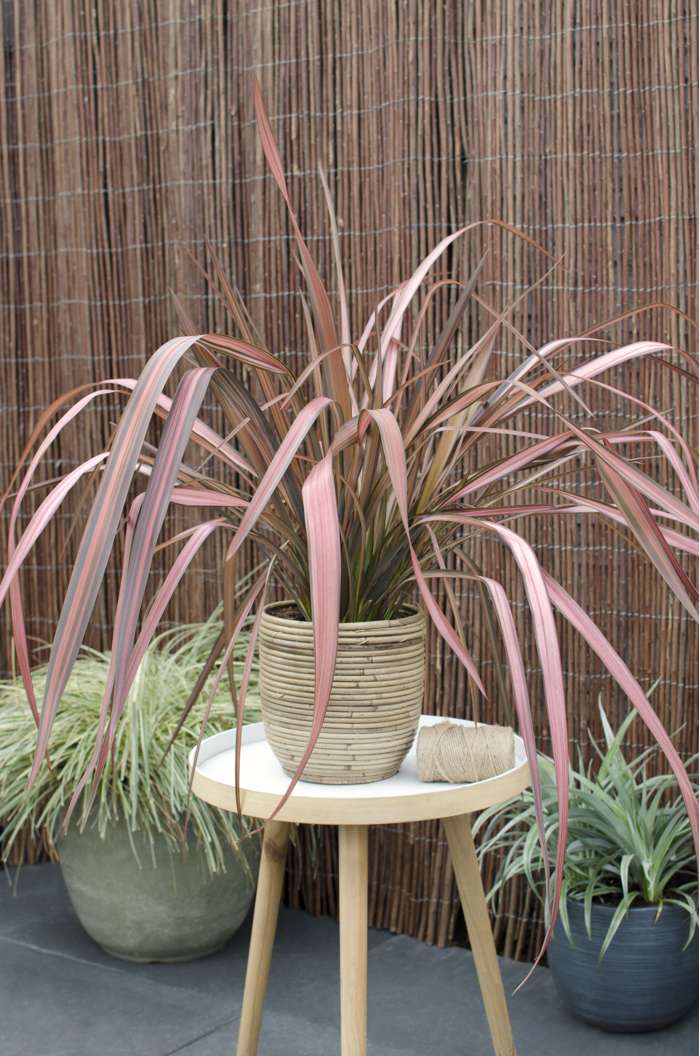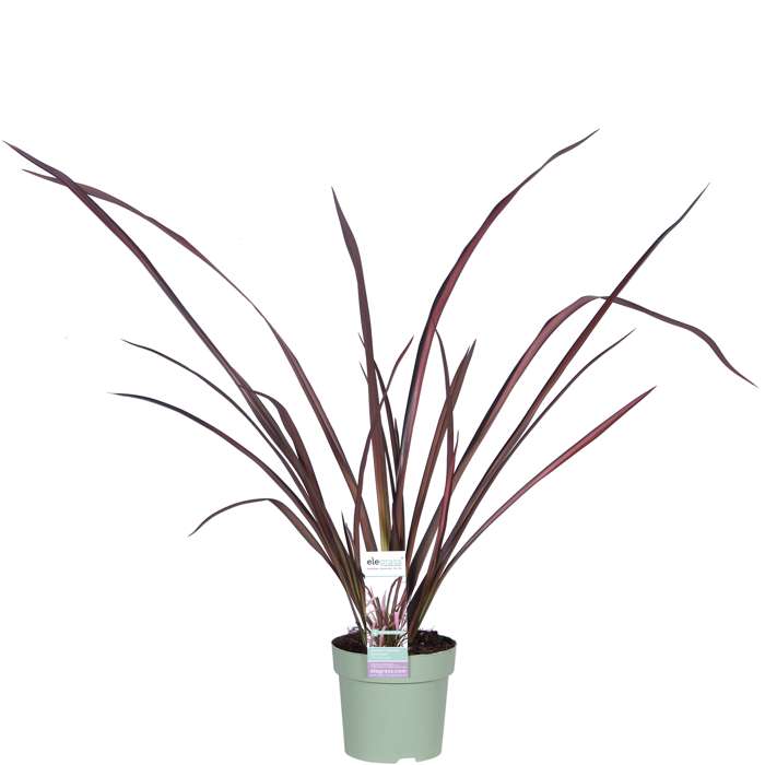‘Phormium tenax Pink Flamingo’, in het Nederlands Nieuw Zeelands vlas genoemd, is een groenblijvende exotische plant en heeft kenmerkende stijve en zwaardachtige bladeren. De rechtopstaande bladeren zijn groen/roze gekleurd. Na enkele jaren kan deze Phormium bloeien met opvallende hoge bloempluimen en buisvormige, donkerrode bloempjes tijdens de maanden juli en augustus. Helaas bloeit de plant in ons zeeklimaat zelden. De Phormium is winterhard en groenblijvend en daardoor een kleurrijke toevoeging aan jouw wintertuin. Deze plant is makkelijk in onderhoud en is hitte en droogte resistent. De Phormium komt het beste tot zijn recht als blik vangende solitair, maar doet het ook goed in groepen. De plant hoeft niet gesnoeid te worden maar je kan wel de dode bladeren weg knippen. De Phormium staat het best op een beschutte plek in droge tot vochthoudende, voedselrijke grond in de volle zon of lichte schaduw.