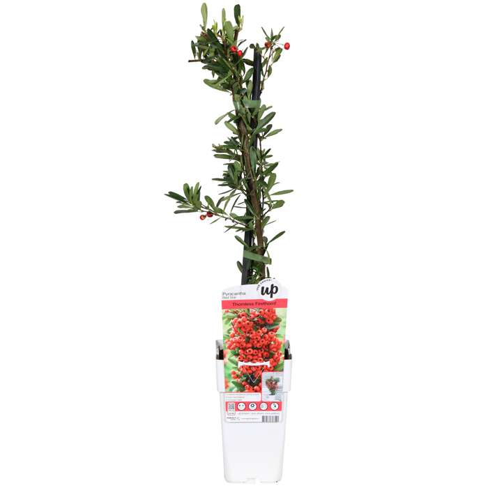 ‘Pyracantha coccinea Red Star’ is een echte ster binnen het vuurdoorn assortiment. Deze vuurdoorn heeft minder doorns en meer bessen dan andere soorten. Het is een wintergroene heester die in juni bloeit met witte bloemen. Op de bloei komen dan ook vlinders en bijen af. Deze bloemen veranderen daarna in bessen welke vanaf september rood kleuren. Vogels zijn ook gek op deze bessen. Hun mooie, heldere intense kleur blijft zeker tot na de kerst. Het is daarom ook een prachtig kerst-item. De plant draagt rijkelijk vrucht op tweejarig hout. Doordat hij enkel op tweejarig hout bloeit is het af te raden om deze struik veel te snoeien. Je kan de Pyracantha neerzetten als solitair in een mooie grote pot op het balkon of terras. Verder is hij ook zeker geschikt in de tuin en zelfs als haag. De plant heeft ondersteuning nodig om te klimmen, hij groeit namelijk als een gewone struik en moet daarom wel vastgebonden worden. Een plek in de zon of halfschaduw is goed voor deze heester en aan de grondsoort stelt hij weinig eisen, elke normale tot vochtige grond is geschikt. Hij is zeer winterhard tot wel -30 graden.