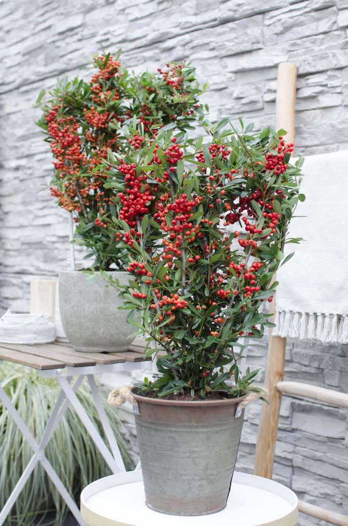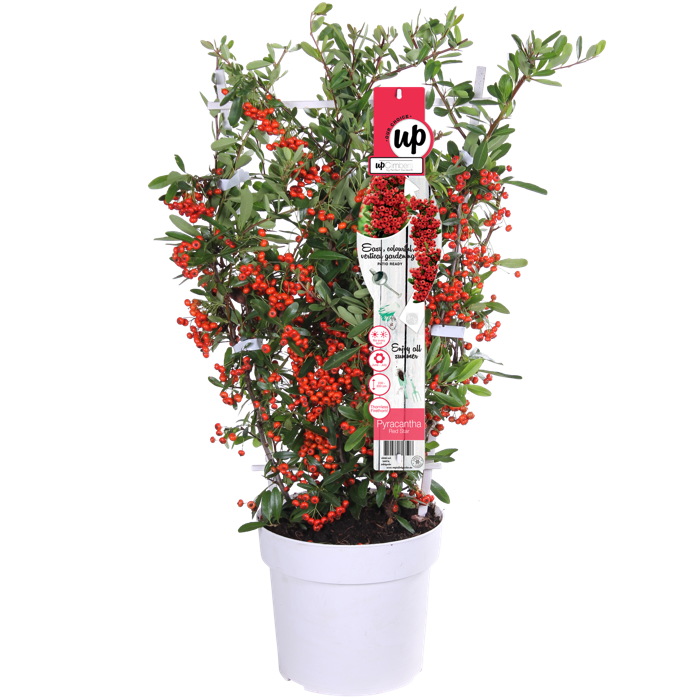 ‘Pyracantha coccinea Red Star’ is een echte ster binnen het vuurdoorn assortiment. Deze vuurdoorn heeft minder doorns en meer bessen dan andere soorten. Het is een wintergroene heester die in juni bloeit met witte bloemen. Op de bloei komen dan ook vlinders en bijen af. Deze bloemen veranderen daarna in bessen welke vanaf september rood kleuren. Vogels zijn ook gek op deze bessen. Hun mooie, heldere intense kleur blijft zeker tot na de kerst. Het is daarom ook een prachtig kerst-item. De plant draagt rijkelijk vrucht op tweejarig hout. Doordat hij enkel op tweejarig hout bloeit is het af te raden om deze struik veel te snoeien. Je kan de Pyracantha neerzetten als solitair in een mooie grote pot op het balkon of terras. Verder is hij ook zeker geschikt in de tuin en zelfs als haag. De plant heeft ondersteuning nodig om te klimmen, hij groeit namelijk als een gewone struik en moet daarom wel vastgebonden worden. Een plek in de zon of halfschaduw is goed voor deze heester en aan de grondsoort stelt hij weinig eisen, elke normale tot vochtige grond is geschikt. Hij is zeer winterhard tot wel -30 graden.