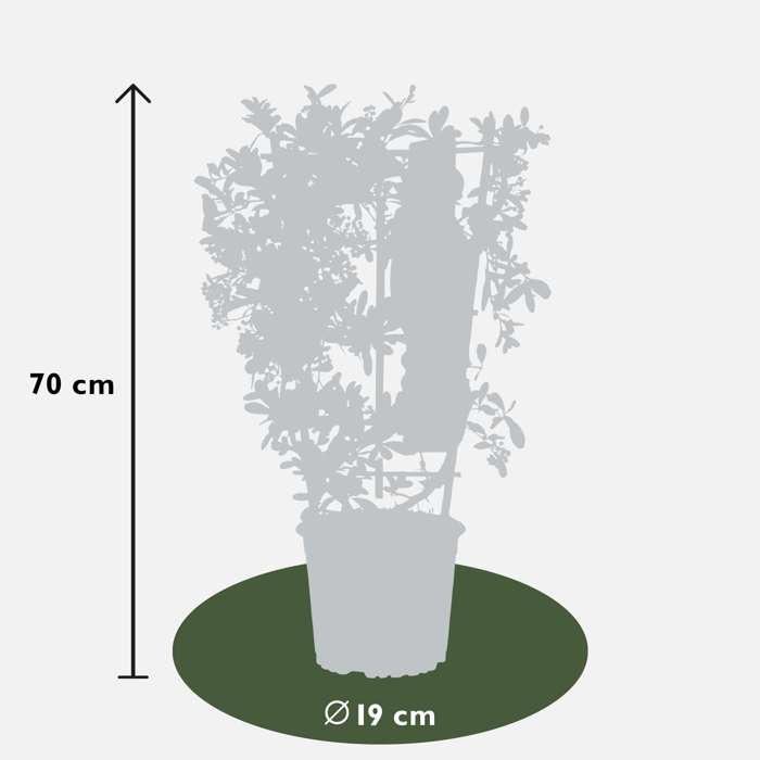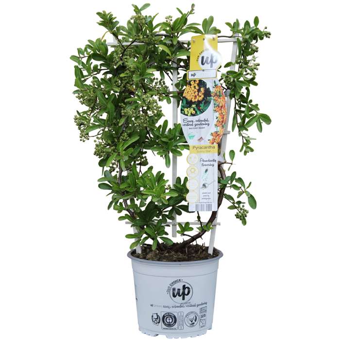 ‘Pyracantha coccinea Sunny Star’ is een echte ster binnen het vuurdoorn assortiment. Deze vuurdoorn heeft minder doorns en meer bessen dan andere soorten. Het is een wintergroene heester die in juni bloeit met witte bloemen. Op de bloei komen dan ook vlinders en bijen af. Deze bloemen veranderen daarna in bessen welke vanaf september geel/oranje kleuren. Vogels zijn ook gek op deze bessen. Hun mooie, heldere intense kleur blijft zeker tot na de kerst. Het is daarom ook een prachtig kerst-item. De plant draagt rijkelijk vrucht op tweejarig hout. Doordat hij enkel op tweejarig hout bloeit is het af te raden om deze struik veel te snoeien. Je kan de Pyracantha neerzetten als solitair in een mooie grote pot op het balkon of terras. Verder is hij ook zeker geschikt in de tuin en zelfs als haag. De plant heeft ondersteuning nodig om te klimmen, hij groeit namelijk als een gewone struik en moet daarom wel vastgebonden worden. Een plek in de zon of halfschaduw is goed voor deze heester en aan de grondsoort stelt hij weinig eisen, elke normale tot vochtige grond is geschikt. Hij is zeer winterhard tot wel -30 graden.