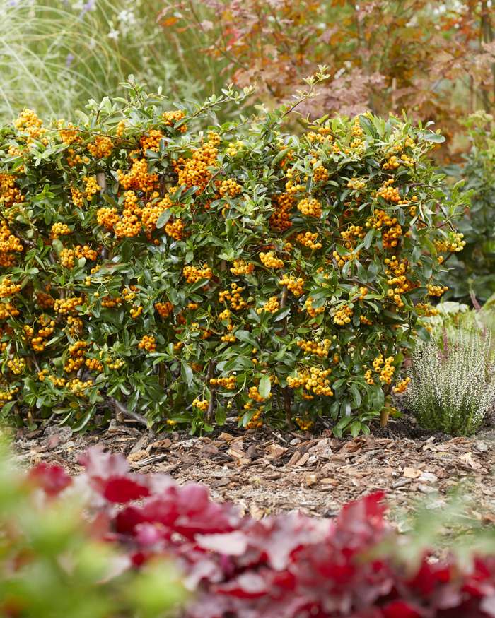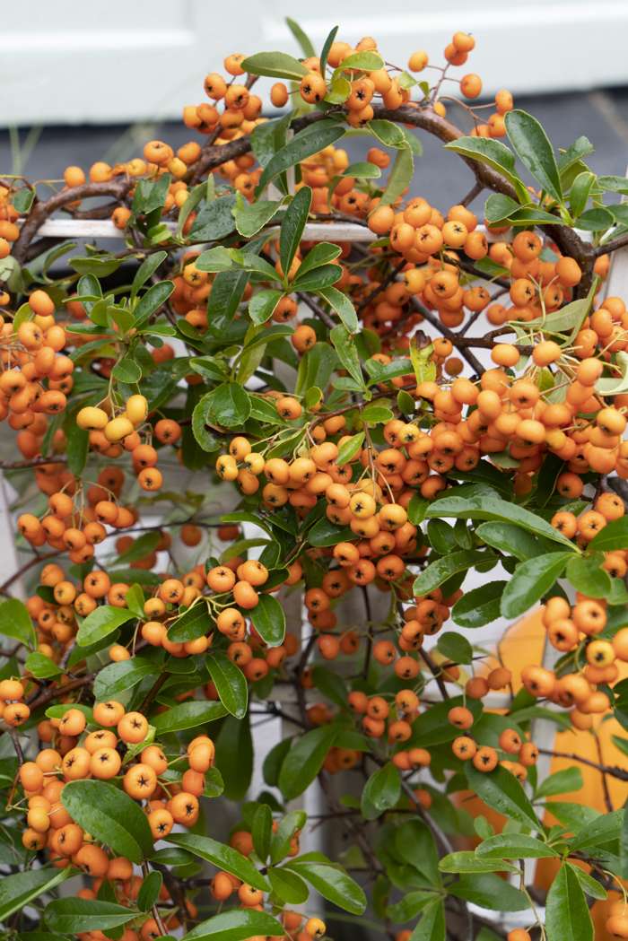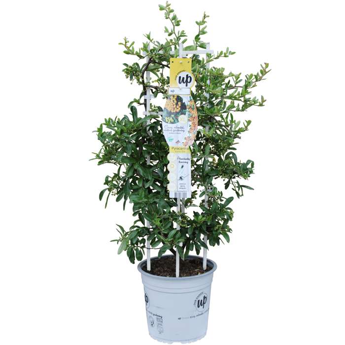 ‘Pyracantha coccinea Sunny Star’ is een echte ster binnen het vuurdoorn assortiment. Deze vuurdoorn heeft minder doorns en meer bessen dan andere soorten. Het is een wintergroene heester die in juni bloeit met witte bloemen. Op de bloei komen dan ook vlinders en bijen af. Deze bloemen veranderen daarna in bessen welke vanaf september geel/oranje kleuren. Vogels zijn ook gek op deze bessen. Hun mooie, heldere intense kleur blijft zeker tot na de kerst. Het is daarom ook een prachtig kerst-item. De plant draagt rijkelijk vrucht op tweejarig hout. Doordat hij enkel op tweejarig hout bloeit is het af te raden om deze struik veel te snoeien. Je kan de Pyracantha neerzetten als solitair in een mooie grote pot op het balkon of terras. Verder is hij ook zeker geschikt in de tuin en zelfs als haag. De plant heeft ondersteuning nodig om te klimmen, hij groeit namelijk als een gewone struik en moet daarom wel vastgebonden worden. Een plek in de zon of halfschaduw is goed voor deze heester en aan de grondsoort stelt hij weinig eisen, elke normale tot vochtige grond is geschikt. Hij is zeer winterhard tot wel -30 graden.