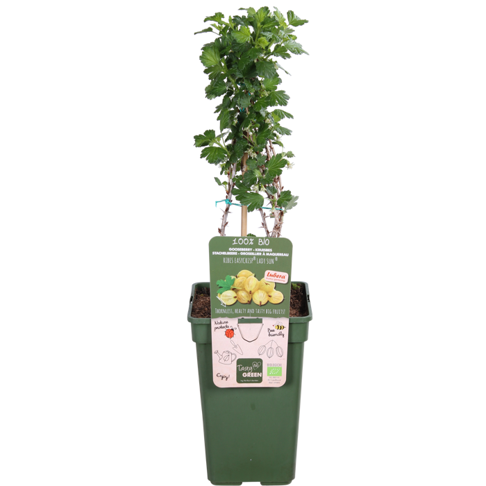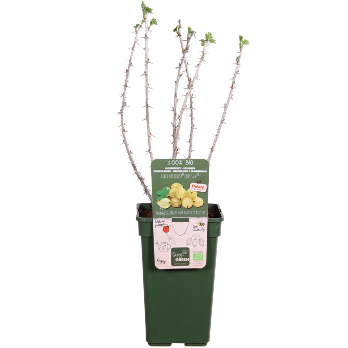 ‘Ribes Easycrisp Lady Sun’ is een gele kruisbes of ook wel stekelbes genoemd. De struik wordt wordt zo’n 75 cm hoog. Het voordeel van deze struik is dat hij minder grote stekels aan de takken heeft zitten in vergelijking tot andere kruisbes soorten. Het is hierdoor makkelijker om de vruchten te plukken. De bladeren zijn aan de onderkant zacht behaard. De kruisbes bloeit in april met onopvallende groenachtige bloemen die voor bijen en hommels aantrekkelijk zijn. De vruchten zijn middelmatig groot, rond en geel van kleur en te plukken rond juli en augustus. De bessen zijn heerlijk sappig en hebben een zoete smaak. Ze worden gevormd in trosjes en zijn direct eetbaar. De struik is bestand tegen vorst waardoor hij zeker de winter zal overleven. In de winter verliest hij zijn blad en dan is het ook de juiste tijd om de struik te snoeien. Hij staat het liefst op een open, zonnige en niet te vochtige grond. Kruisbessen hebben steun nodig bij het groeien. Het is daarom aan te raden de stengels langs een klimrek of gaas te binden.